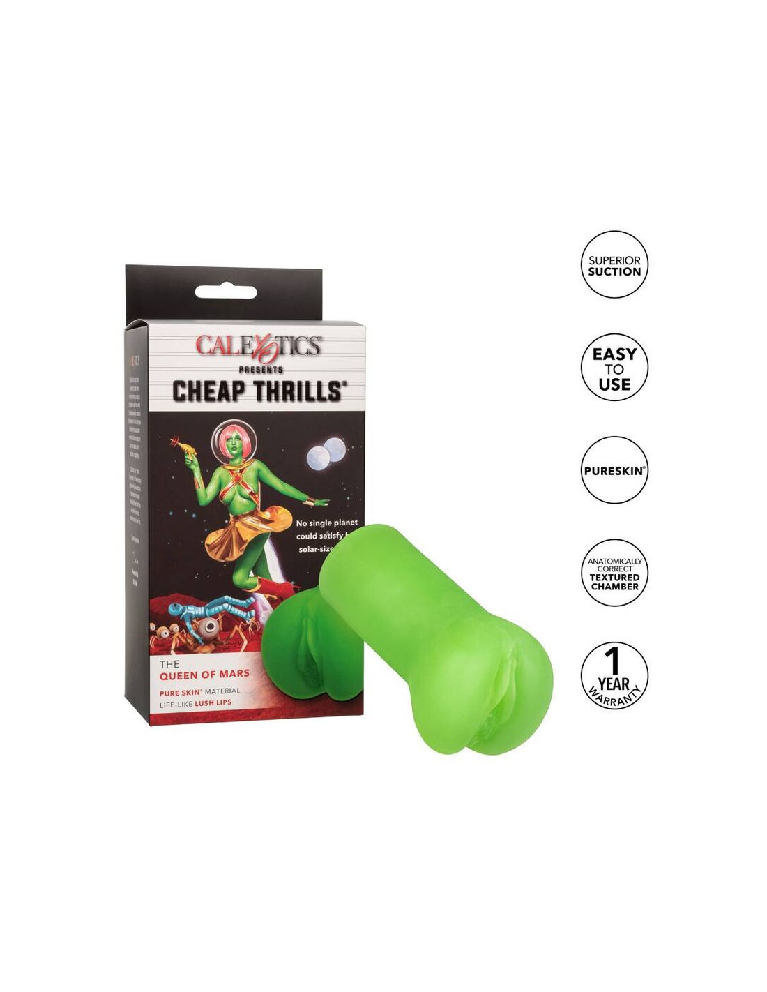 Blast off to a whole new galaxy of pleasure when you slip in the Cheap Thrills The Queen of Mars stroker. The closed-end design provides superior suction, while the uniquely textured chamber and ultra soft, stretchy Pure Skin material thrills with life-like sensation. Whether indulging at home or wherever pleasure takes you, the compact 5.5 14 cm is the teasing travel companion youre craving. The premium Pure Skin is unscented, phthalate free and maintenance free for truly explosive results.