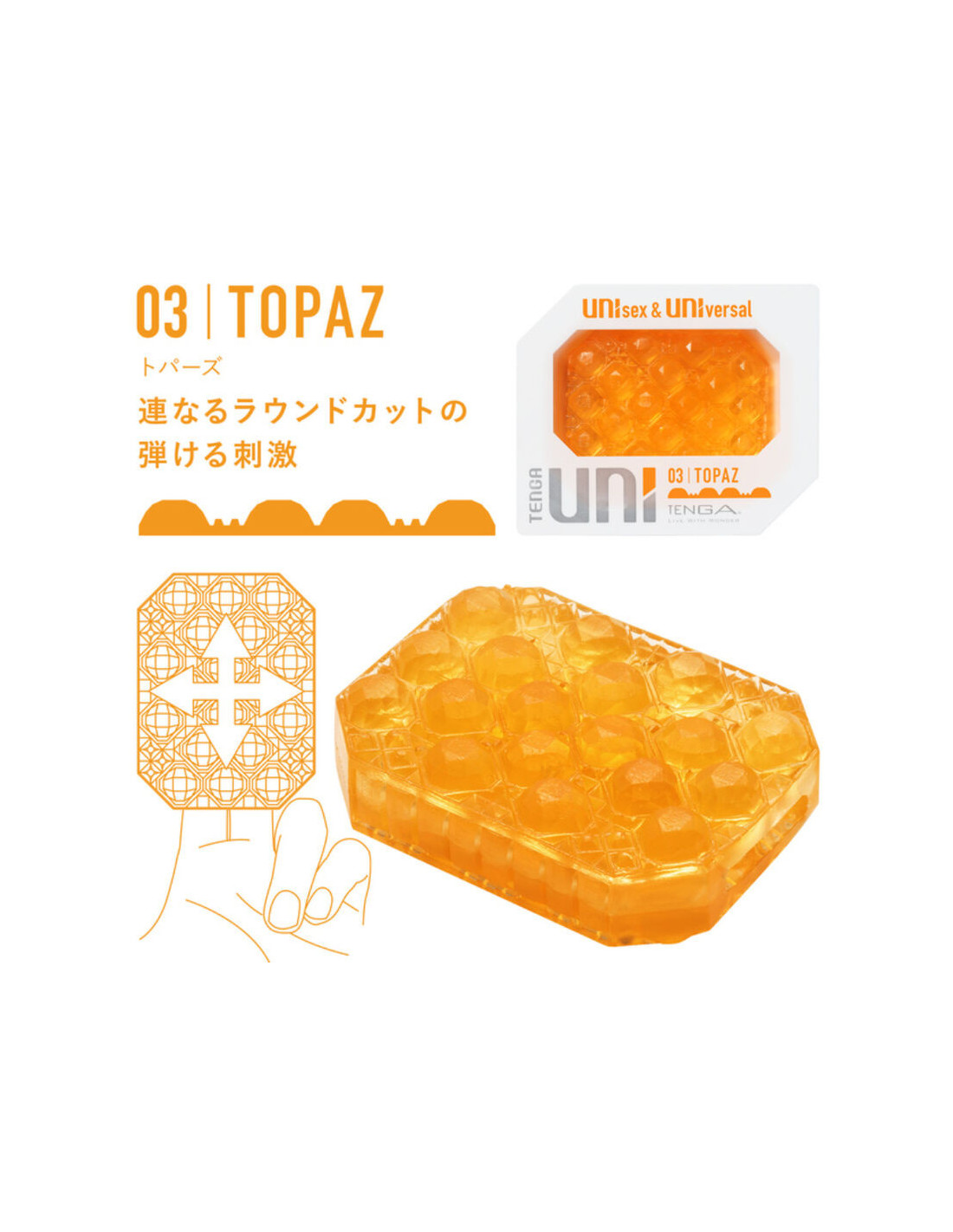- TOPAZ: Popping stimulation with continuous round cuts. Enjoy the stimulation of rolling and popping thanks to the continuous round details throughout the surface.