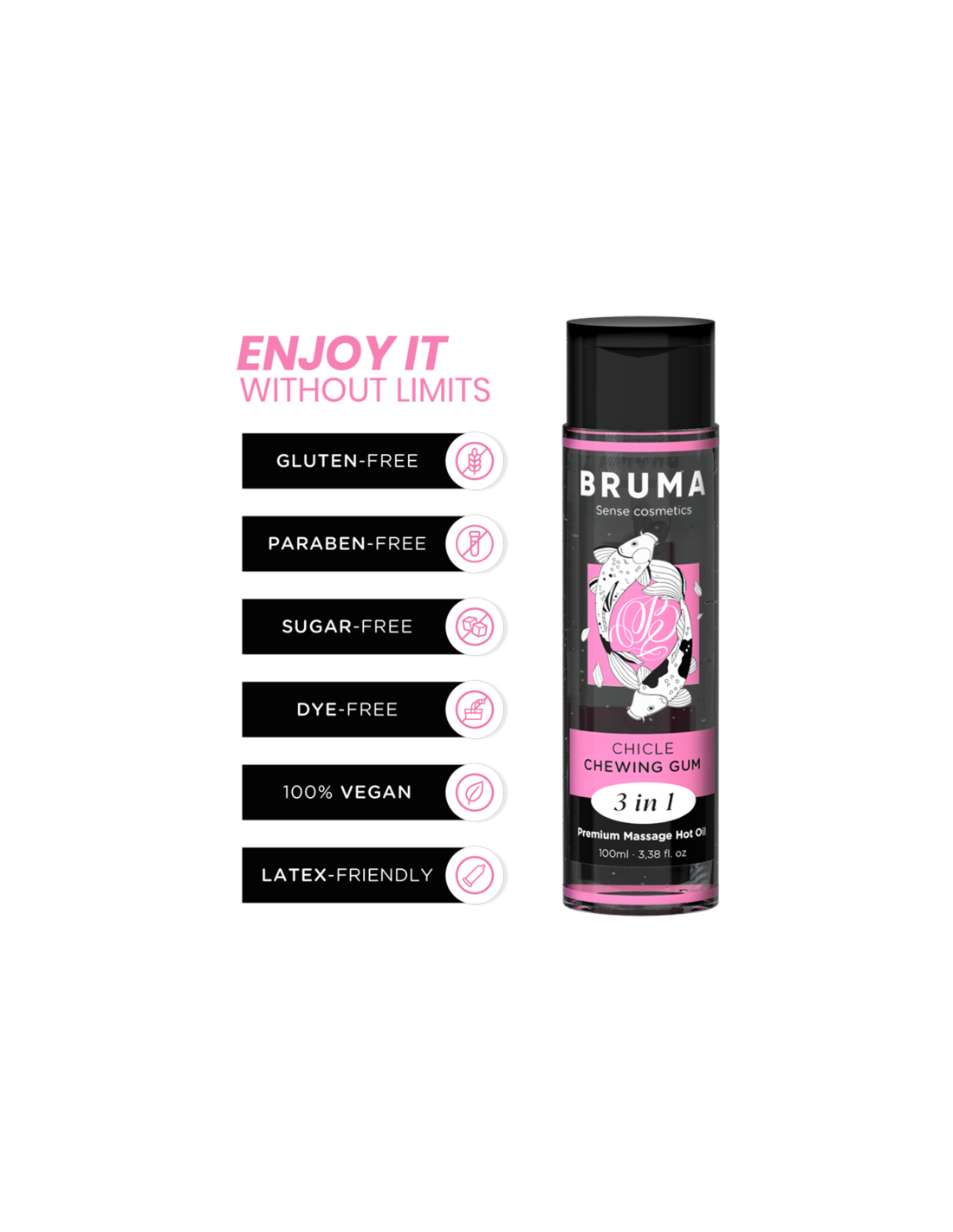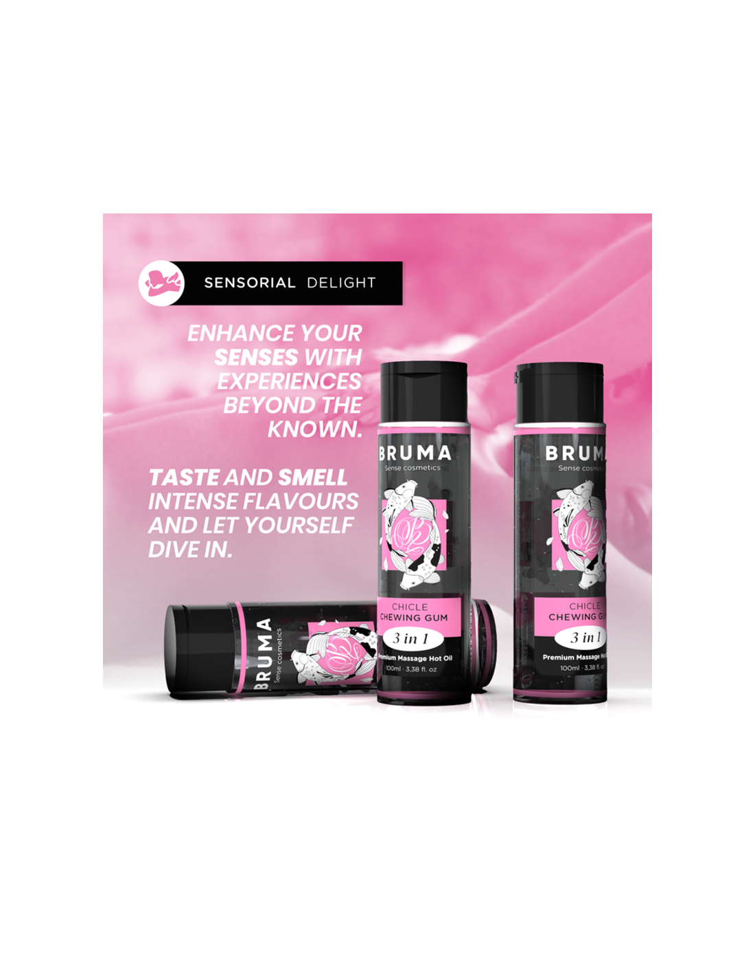 The Premium Heat Effect Massage Oil chewing gum flavor from the BRUMA brand is a true gem in the world of well-being and intimacy. This exquisite product, presented in an elegant 100 ml container, is Designed to provide a unique and sensual experience, providing a relaxing and stimulating massage with a touch of warmth that makes it even more special. here Here are the highlights developed in detail: