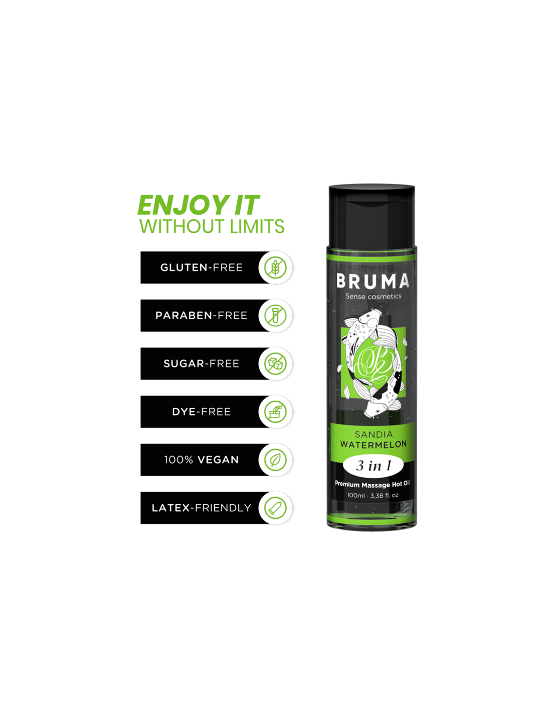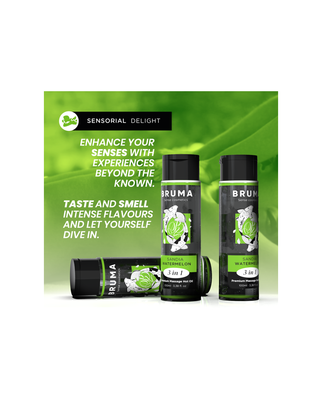 The Premium Heat Effect Massage Oil watermelon flavor from the BRUMA brand is a true gem in the world of well-being and intimacy. This exquisite product, presented in an elegant 100 ml container, is Designed to provide a unique and sensual experience, providing a relaxing and stimulating massage with a touch of warmth that makes it even more special. here Here are the highlights developed in detail: