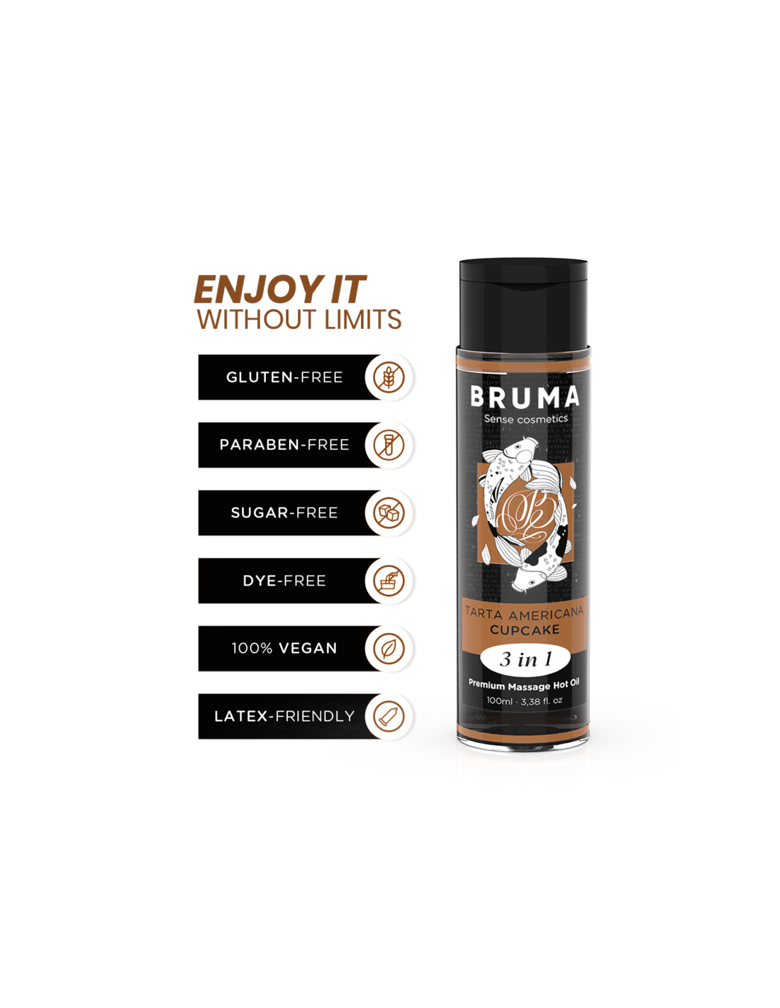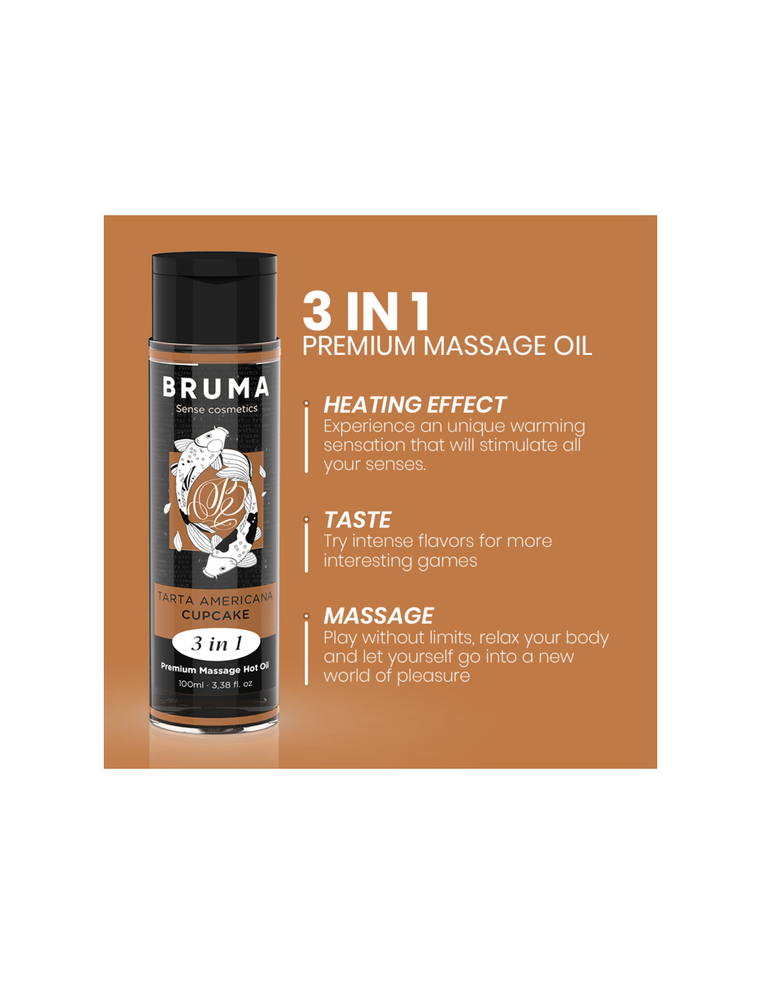 The Premium Heat Effect Massage Oil cupcake flavor from the BRUMA brand is a true gem in the world of well-being and intimacy. This exquisite product, presented in an elegant 100 ml container, is Designed to provide a unique and sensual experience, providing a relaxing and stimulating massage with a touch of warmth that makes it even more special. here Here are the highlights developed in detail: