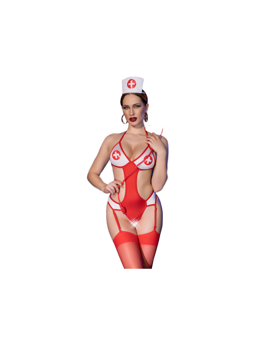 The stethoscope is an essential accessory to complete the nurse look. Although in this context it may be more decorative than functional, it adds authenticity to the costume and reinforces the medical theme. The cap is another distinctive element of the nurse uniform. In this case, it is Decorated with the red cross logo, which is an internationally recognized symbol associated with emergency medical services and healthcare. The hat adds a finishing touch to the outfit and reinforces the nurse image.