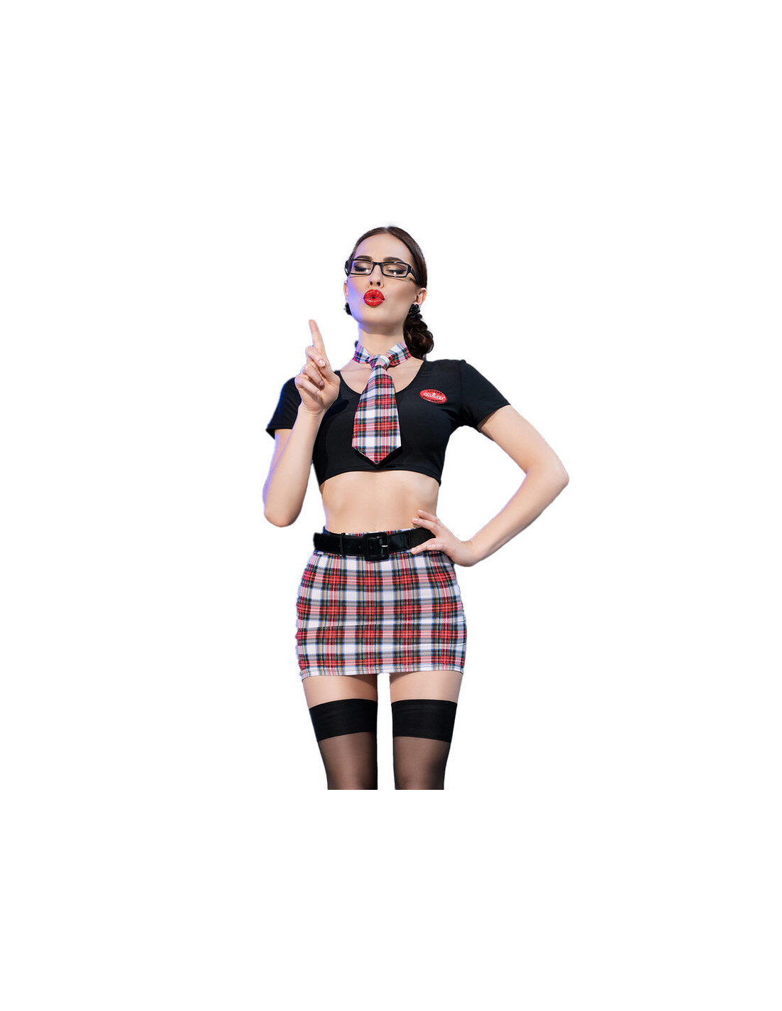 Glasses are an iconic accessory that completes the intellectual schoolgirl look. They can be thick-rimmed and add a touch of innocence and seriousness to the costume. The tie is another characteristic element of the school uniform. In this case, its probably a small tie or bow tie that fits the schoolgirl style.
