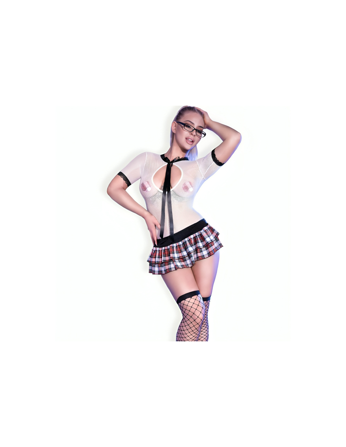 The skirt is short and pleated, with a plaid pattern that evokes the classic image of the schoolgirl. This style is playful and provocative, ideal for highlighting the legs and adding a touch of mischief to the outfit. Glasses are an iconic accessory that completes the intellectual schoolgirl look. They can be thick-framed and add a touch of innocence and seriousness to the costume.