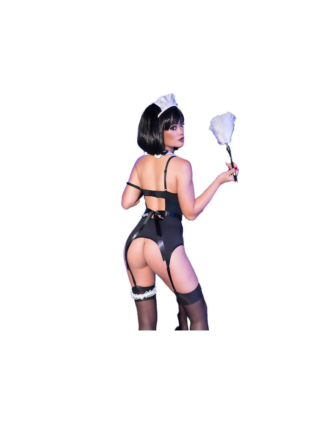 This set exudes sophistication and appeal in every detail, from the delicate band that adorns your hair to the sensual stockings that hug your legs with their dark charm. Each piece has been carefully selected to create an unforgettable experience of seduction.