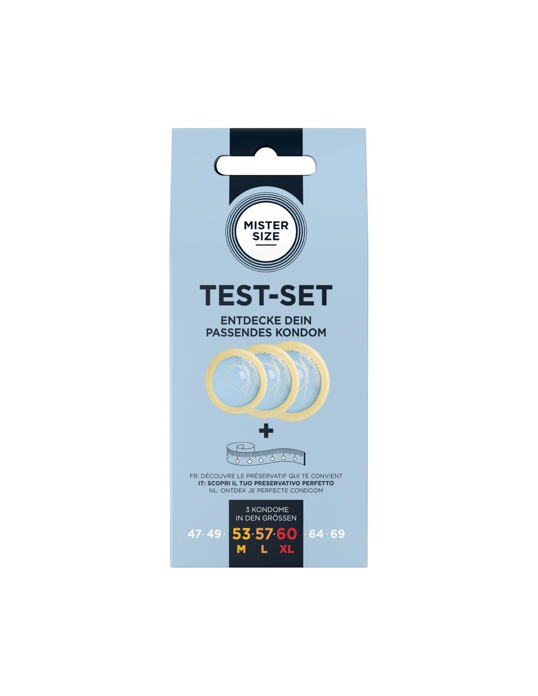 Raskite savo dydį su dydžio testavimo rinkiniu. Testavimo MISTER SIZErinkinys su matavimo juosta ir vidutinio dydžio bandomųjų prezervatyvų pakuote padės jums rasti idealų prezervatyvo dydį. Rinkinyje esantys 53 mm, 57 mm ir 60 mm dydžiai yra labiausiai paplitę. Jei naudojate kitokį dydį, galite jį patikrinti matavimo juosta ir pajusti skirtumą su vidutinio dydžio bandomųjų prezervatyvų pakuote.