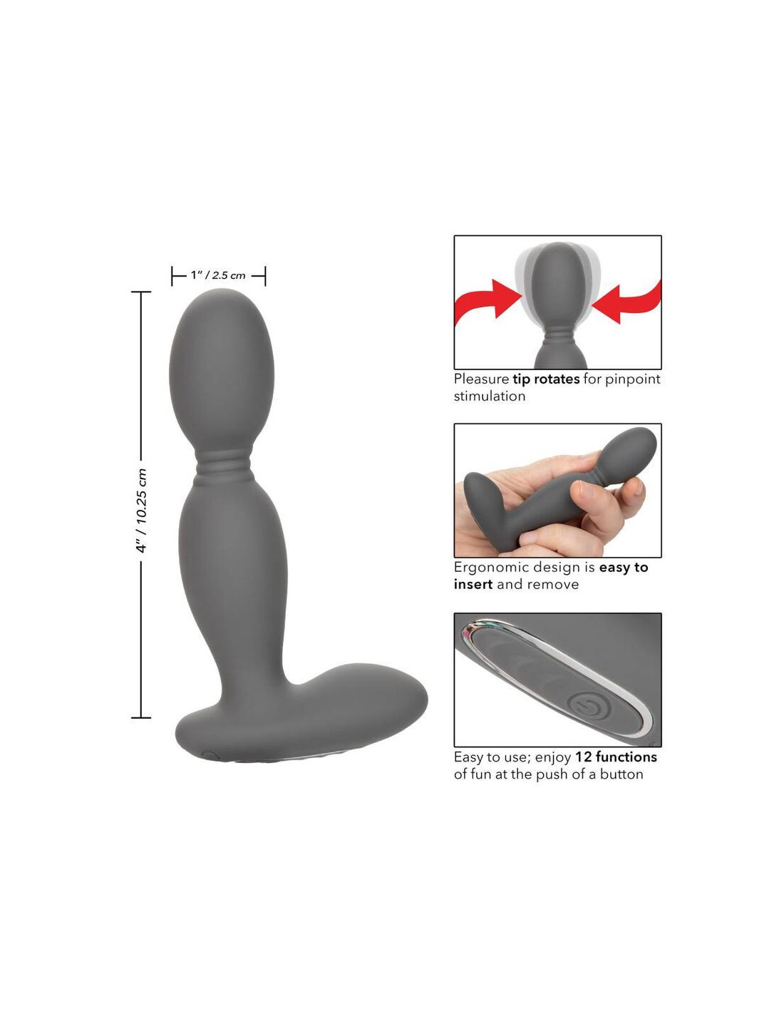 „Eclipse Rotator Probe“ – tai jausmingas silikoninis zondas, sukurtas tam, kad palengvintų jaudinantį analinį malonumą. Ergonomiškas dizainas ir minkštas silikonas leidžia žaisti lengvai, o besisukantis galiukas ir 12 galingų vibracijos funkcijų suteikia stulbinantį malonumą. Pasirinkite malonumo intensyvumą ir pasinerkite į orgazminės vidinės stimuliacijos bangas su sinchronizuotu sukimusi ir vibracija. Jausmingai išlenktas kotas, kontūruotas pagrindas ir lengvas valdymas leidžia pasinerti į nesudėtingą stimuliaciją. Kontūruotas korpusas ir besisukantis galiukas pasiekia giliausius jūsų malonumus pačiais seksualiausiais momentais. Mėgaukitės patogiu įdėjimu, lengva stimuliacija ir švelniu išėmimu su ergonomiška forma ir išlenktu pagrindu. Įkraukite aukščiausios kokybės silikoninį masažuoklį per 1 valandą naudodami pridedamą USB įkrovimo laidą ir mėgaukitės 40 minučių greita stimuliacija arba 60 minučių mažo greičio vibracija. Nors paprastas mygtukas kontroliuoja intensyvumą, o minkštas zondas suteikia norimą stimuliaciją, integruotas modernus atminties lustas prisimena, kaip jums patinka, paleisdamas paskutinę naudotą funkciją.
