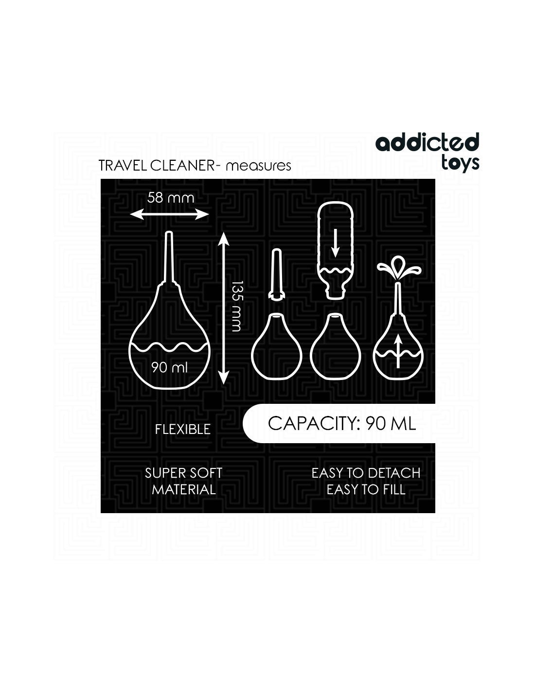 „Addicted Toys“ kelioninis S dydžio analinis valiklis yra puikus pasirinkimas tiems, kurie ieško patogaus, diskretiško ir efektyvaus būdo palaikyti tinkamą higieną prieš arba po analinės stimuliacijos. Dėl kompaktiško dydžio ir 90 ml talpos jis puikiai tinka tiems, kurie nori jį pasiimti su savimi arba greitai ir patogiai naudoti bet kuriuo metu. Ergonomiškas ir paprastas dizainas užtikrina, kad galėsite patogiai ir saugiai nusiprausti.