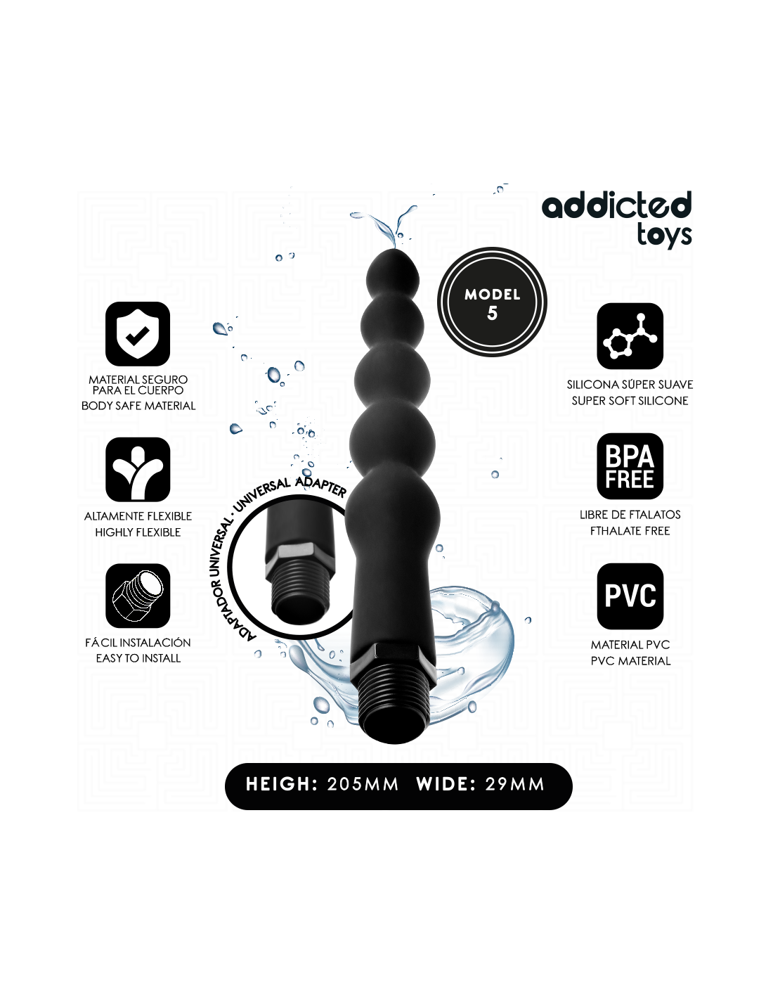 ADDICTED TOYSTinkamai pasiruošę tyrinėkite be ribų. Intymi higiena yra raktas į tai, kad galėtumėte mėgautis analiniais malonumais iki galo, o su „Addicted Toys“ analiniu valikliu užtikrinsite gilų, saugų ir be rūpesčių valymą. Šis 5 modelis , priklausantis 6 skirtingų dizainų asortimentui, yra sukurtas taip, kad būtų patogus, minkštas ir veiksmingas jūsų kasdienės ar prieš žaidimus atliekamos intymios rutinos dalis. Pagamintas iš aukščiausios kokybės medžiagų, tokių kaip lankstus PVC ir itin minkštas silikonas, šis priedas yra visiškai saugus kūnui ir be ftalatų, atitinkantis aukštus higienos standartus. Dėl universalaus adapterio jis suderinamas su dauguma dušo sistemų, todėl jį lengva sumontuoti per kelias sekundes ir užtikrinamas praktiškas bei be rūpesčių naudojamas prietaisas.