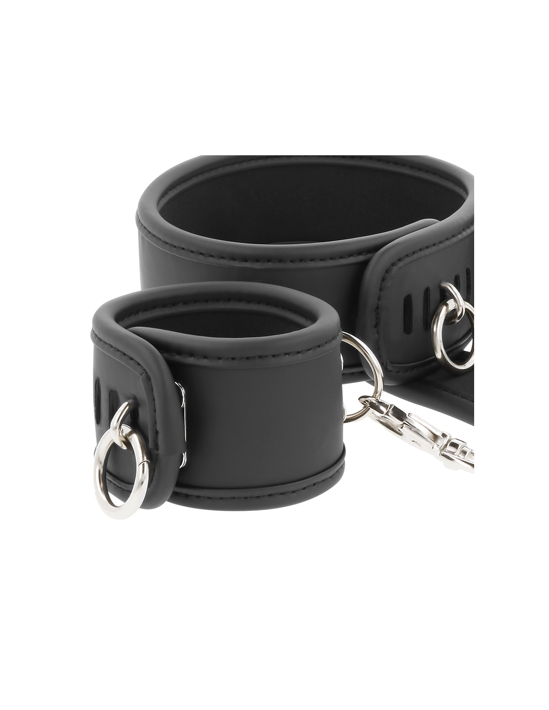 Šie antrankiai pasižymi elegantiška estetika, kurios ieškote, ir absoliučiu efektyvumu. Dvisluoksniai ir su metaline sagtimi, jūsų paklusnusis partneris negalės pabėgti. Paminkštintas vidus užtikrina, kad jie išliks patogūs, nesvarbu, kiek stipriai jie tempsis ar kiek ilgai žais. Rinkinyje yra jungiamoji grandinė, skirta imobilizuoti nuo kaklo iki rankų.