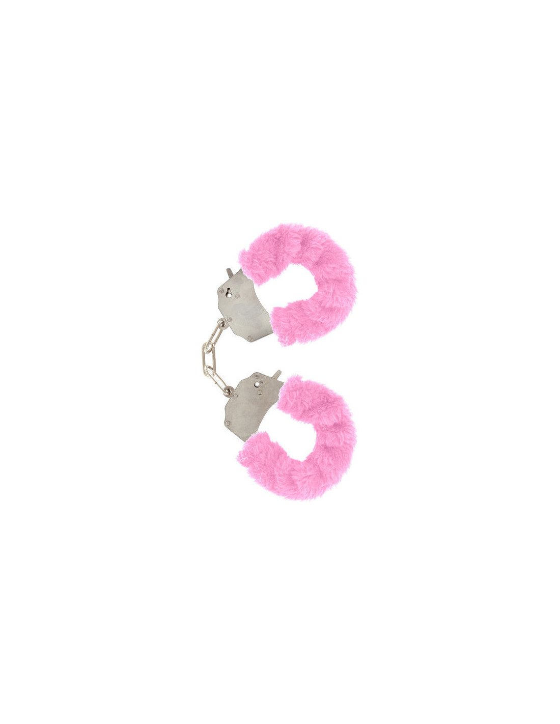 Nuostabios dviejų dalių riešo sporos, sujungtos chromuoto plieno grandine, aplink rausvus rankogalius padengtos minkštu pliušiniu žaislu.