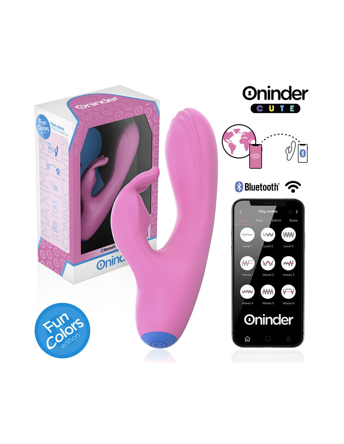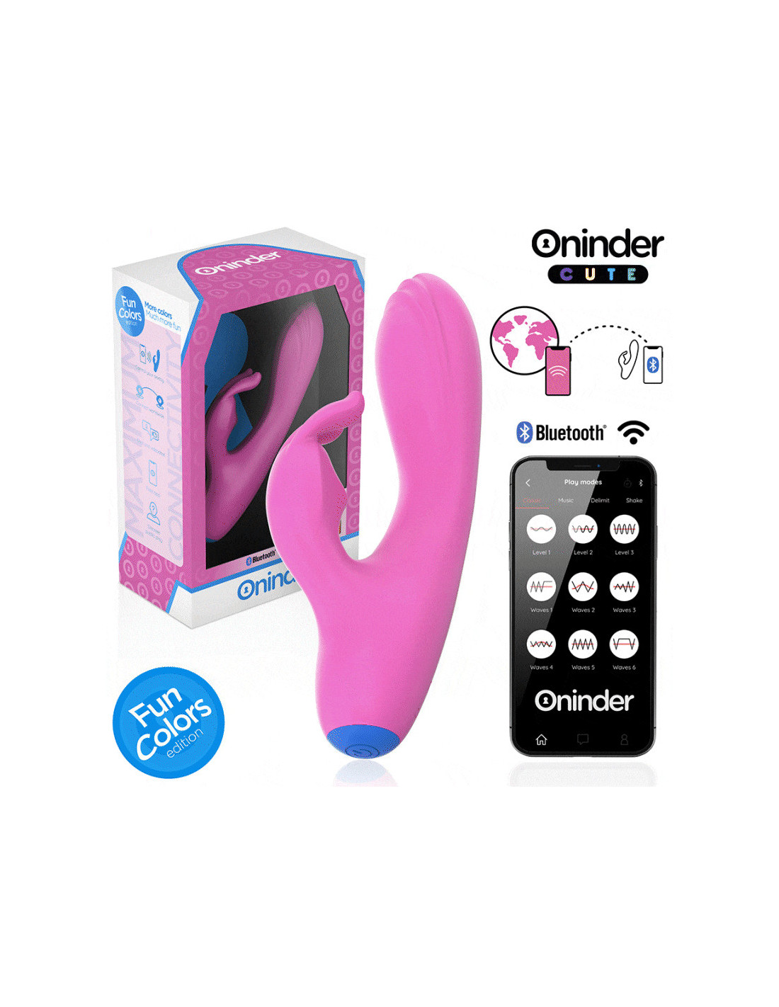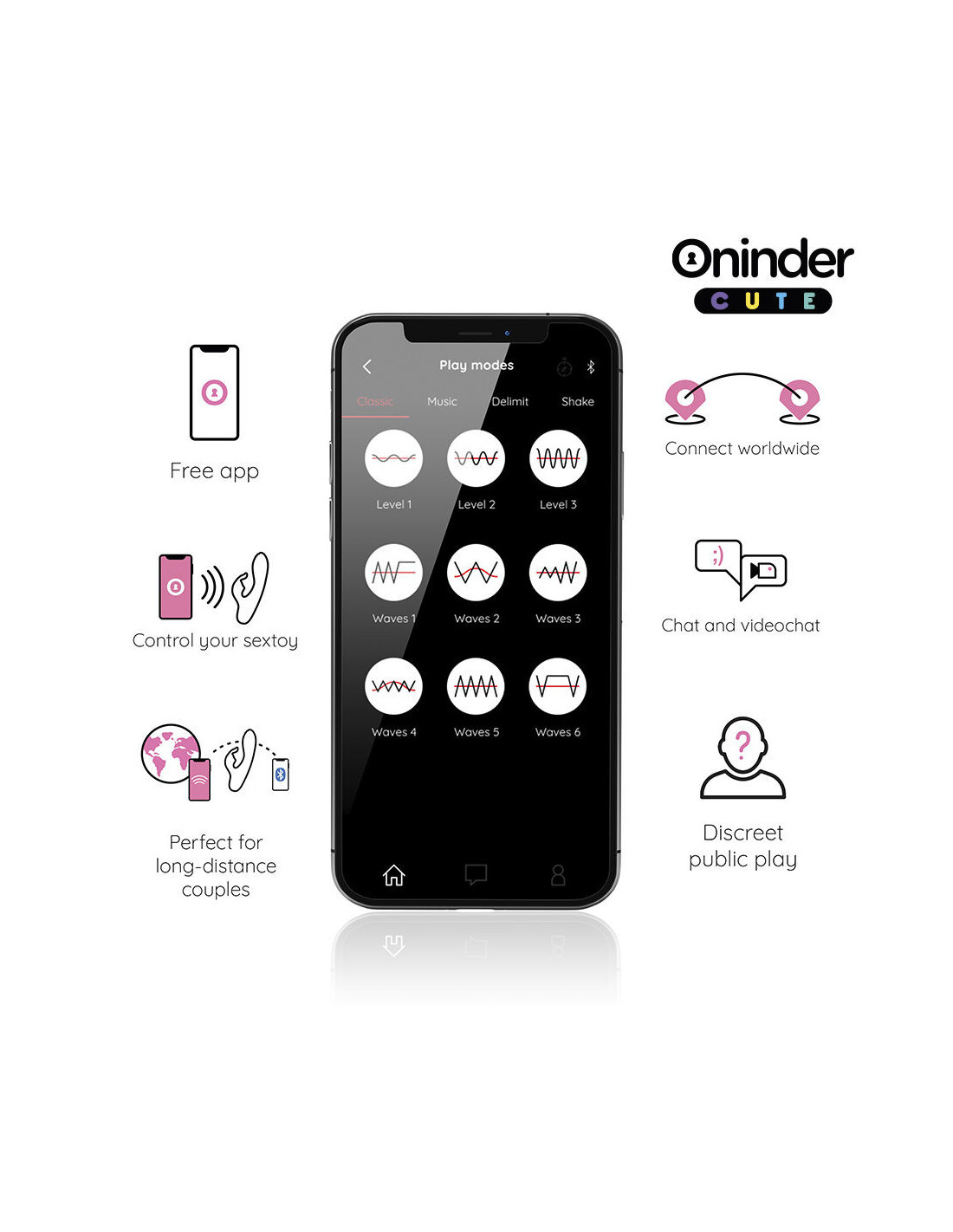 Su šiuo vibratoriumi galite ne tik rinktis iš iš anksto nustatytų intensyvumo ir vibracijos derinių, bet ir dalytis novatoriška programėle pagrįsta valdymu. Tiesiog atsisiųskite nemokamą... ONINDER™ programėlę į savo „Android“ arba „iOS“ įrenginį ir prijunkite išmanųjį telefoną arba planšetinį kompiuterį.