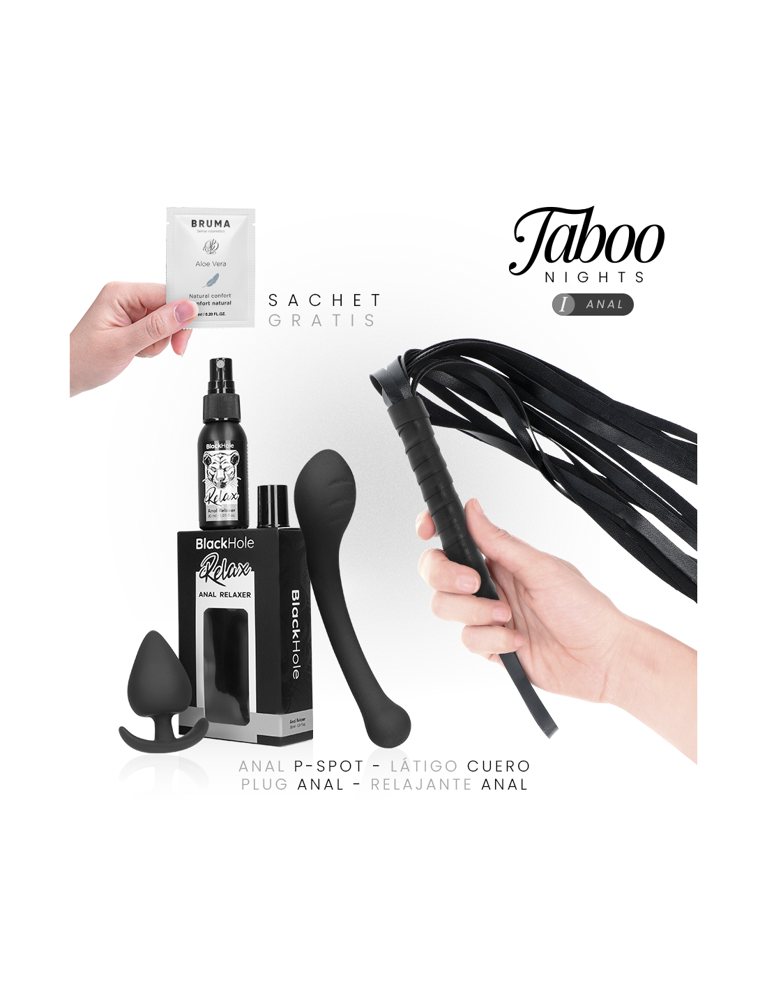 TABOO NIGHTS – 1: ANAL yra išsamus rinkinys, skirtas pažinti analinį malonumą progresyviu, saugiu ir maloniu būdu. Sukurtas tiek pradedantiesiems, tiek tiems, kurie nori sustiprinti patirtį, jis apima kruopščiai atrinktą produktų asortimentą, kuris derina stimuliaciją, pasiruošimą ir komfortą.