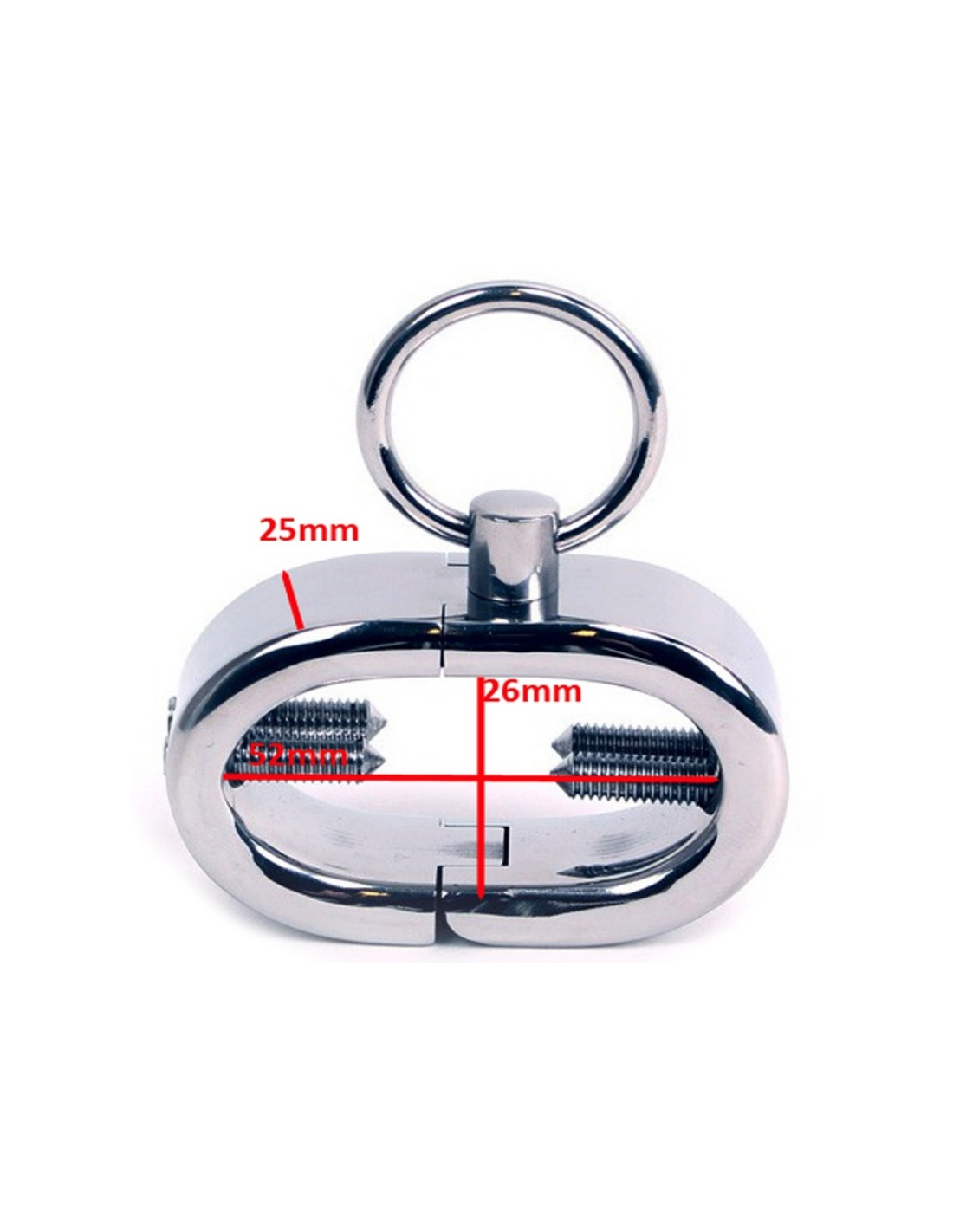 Ovalios formos metalinė sėklidės manžetė, sukurta taip, kad idealiai priglustų aplink kapšelį tarp varpos pagrindo ir sėklidžių. Su keturiais varžteliais spaudimui, kurį galima reguliuoti pridedamu šešiakampiu raktu, ir žiedu, skirtu pritvirtinti ir atlikti kitus fetišo žaidimus.