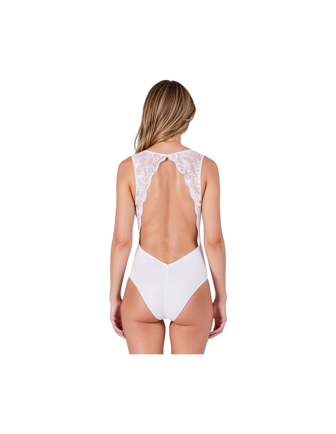 Išskirtinis šio dizaino bruožas – jausmingai atvira nugara, įrėminta išskirtiniais nėriniais, kurie pereina į elegantišką iškirptę, subtiliai išryškindami pečius ir nugarą. Ši detalė paryškina bodžiuką, todėl jis atrodo įspūdingai tiek kaip apatinis trikotažas, tiek prie ypatingos aprangos, pavyzdžiui, su švarku.