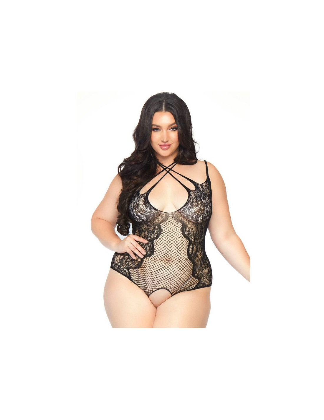 Prestižinio apatinio trikotažo prekės ženklo „Leg Avenue“ pagamintas tinklelio ir nėriniuotų drabužių komplektas be tarpkojo, su daugiasluoksne juostele ir dirbtiniais raišteliais nugaroje. Padidinkite savo moteriškumą įsigydami išskirtinį gundymo, jausmingumo ir elegancijos drabužį.