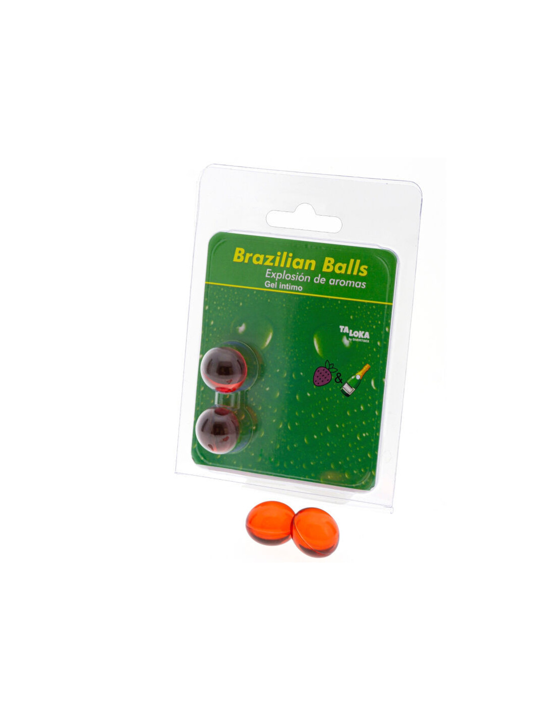 2 braziliški kamuoliukai su lubrikantu, kurie suteikia malonumo sprogimą su jaudinančių pojūčių ir aistringo braškių bei šampano aromato mišiniu.