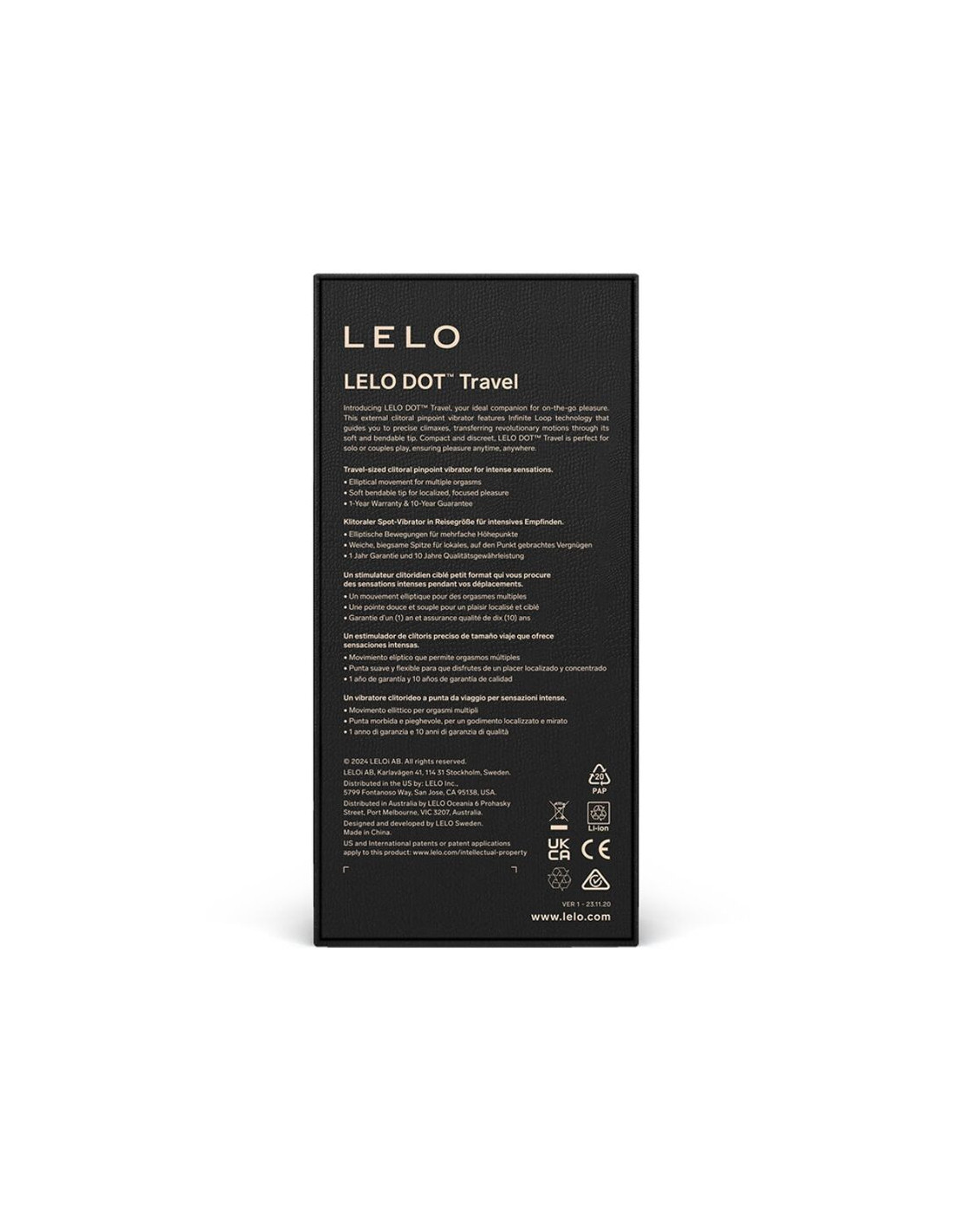 LELO DOT™ Travel“ – tai diskretiškas, tikslus klitorio stimuliatorius, puikiai tinkantis pasiimti su savimi į bet kokią kelionę, nes dėl savo mažo dydžio jis telpa į bet kokį lagaminą ar krepšį. Jis turi aštuonis galingus vibracijos režimus su skirtingu intensyvumu. LELO DOT™ Travel“ sukurtas „Infinite Loop™“ leidžia suasmeninti orgazminę patirtį keičiant minkšto ir lanksčio galiuko padėtį.