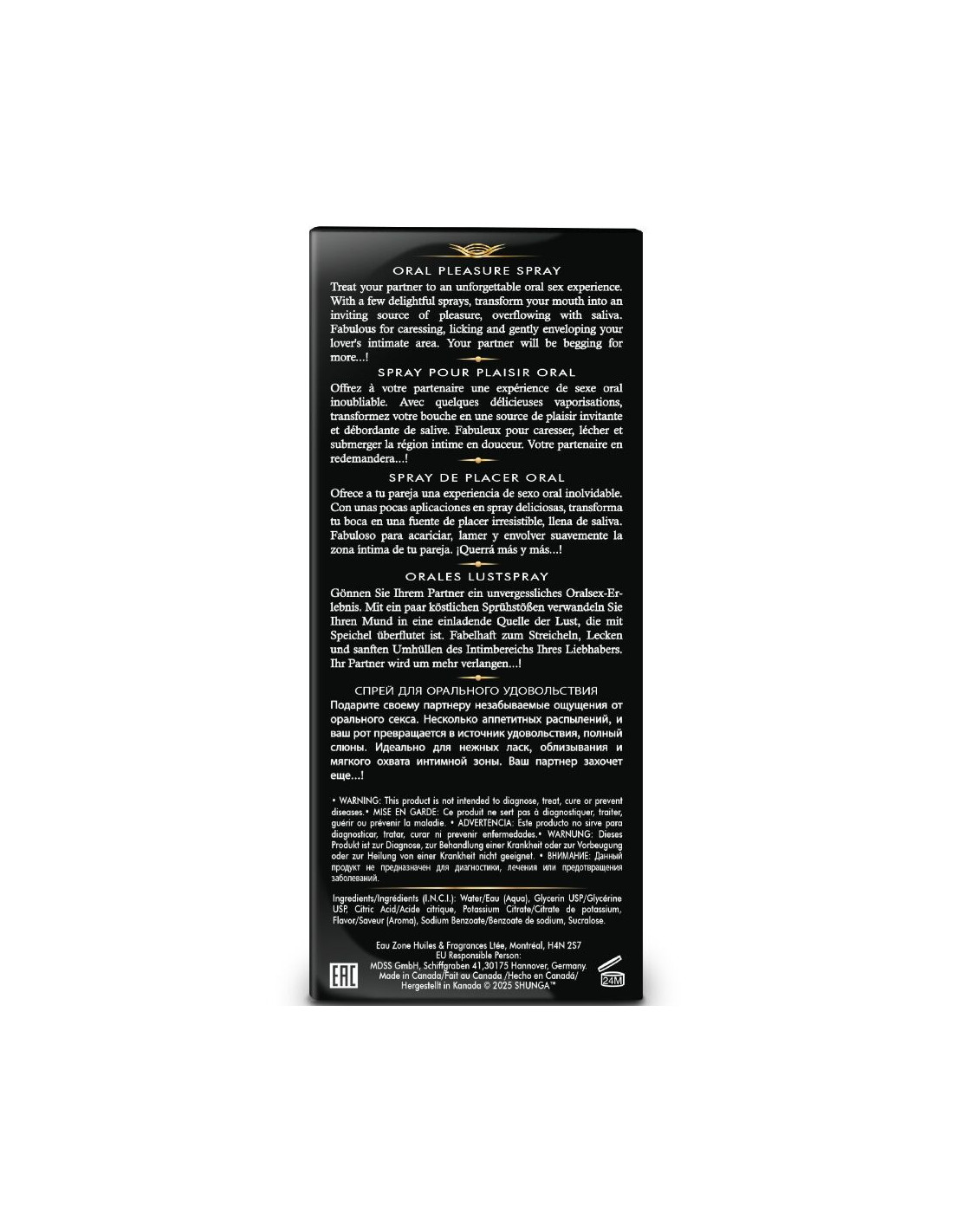 SHUNGA APHRODISIACSAtraskite naują būdą mėgautis oraliniu seksu su šiuo purškikliu, sukurtu pakelti patirtį į kitą lygį. Vos keliais papurškimais jūsų burna įgaus minkštesnę, drėgnesnę tekstūrą, puikiai tinkančią jausmingam kiekvieno intymaus partnerio kampelio tyrinėjimui. Gardūs jo skoniai pažadina pojūčius ir kiekvieną bučinį, kiekvieną laižymą ir kiekvieną prisilietimą paverčia nenugalimu stimuliu, kuris natūraliai didina geismą.