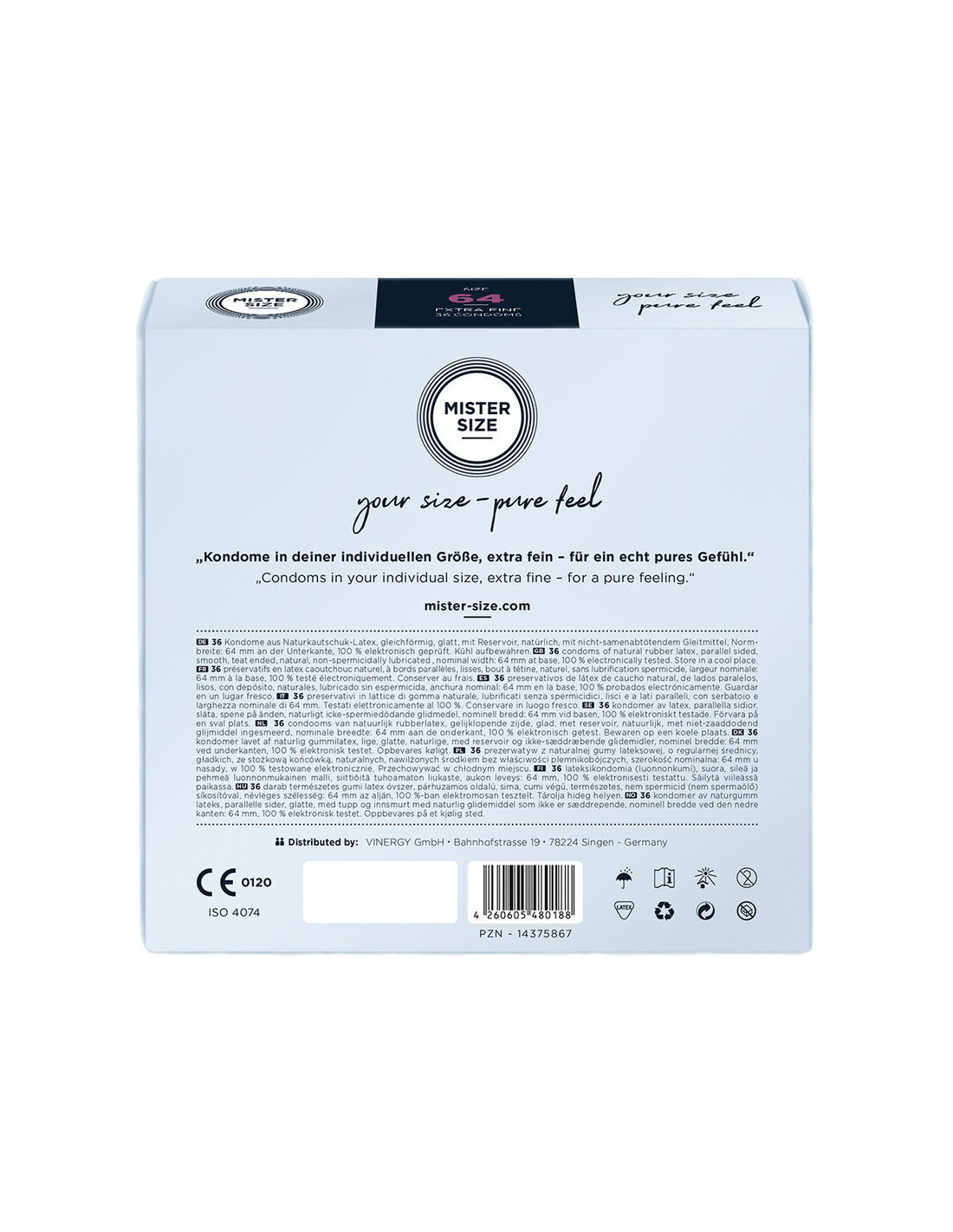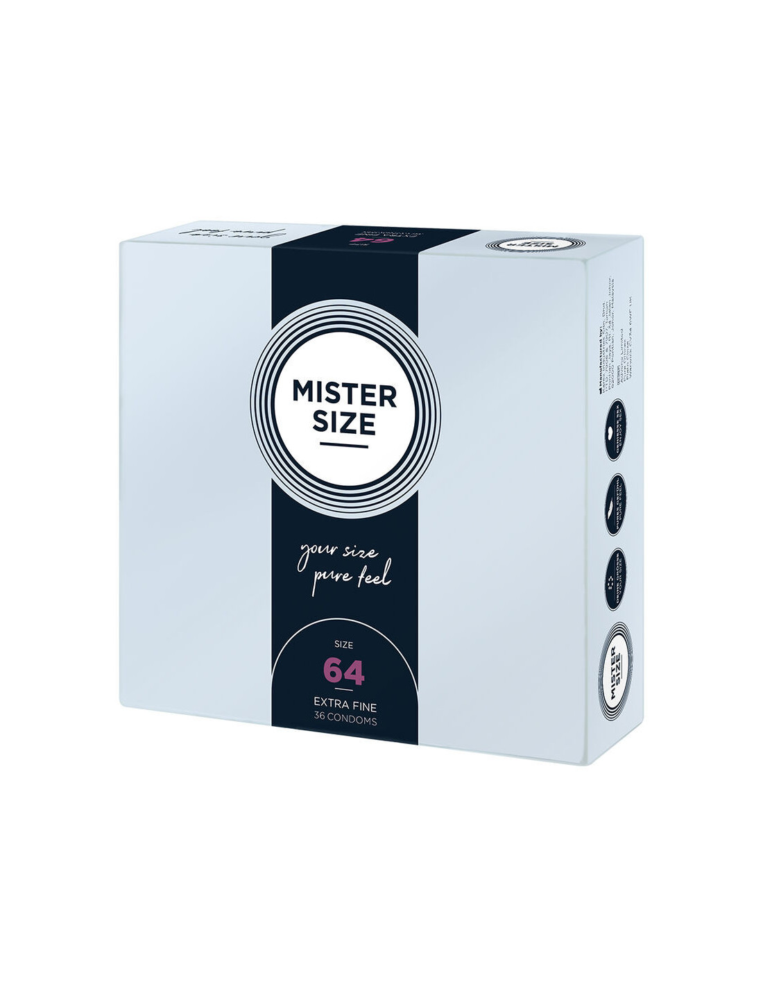 MISTER SIZESu MISTER SIZE 64 turite prezervatyvą, kuris suteikia malonų pojūtį visomis prasmėmis. Žnypštimas, gniaužimas ir jausmas, kad jūsų vyriškumas dusinamas, yra praeitis! Nuo šiol prasideda grynas malonumas. Prieš pat mylėjimąsi, sukuriama nuostabi sąjunga lengvai užtraukiant prezervatyvą ant jūsų stipraus ir tvirto varpos – sąjunga, kuri sukurs nuostabias juslinio malonumo akimirkas. Lengvas ir tobulas prigludimas prie jūsų asmeninio prezervatyvo dydžio. Kad ir kas nutiktų praeityje, prezervatyvas gali ir visada turėtų puikiai tikti! Jūsų asmeninis dydis, MISTER SIZE prezervatyvas šiltai apgaubia jūsų varpą tarsi antra oda ir sukuria natūralų pojūtį. Dabar galite atsipalaiduoti ir pagaliau visiškai atsipalaiduoti sekso metu.