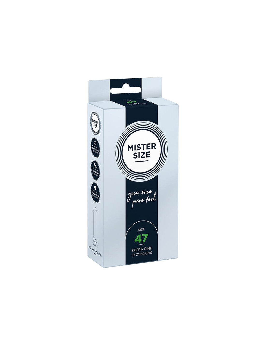 MISTER SIZE„ MISTER SIZE 47“ yra mažiausias iš septynių mūsų dydžių. Tačiau tai nebūtinai turi būti nepatogu. Plonesnė varpa suteikia daugiau lankstumo lytinių santykių metu ir gali suteikti geriausius pojūčius, ypač tinkamai pasiruošus.