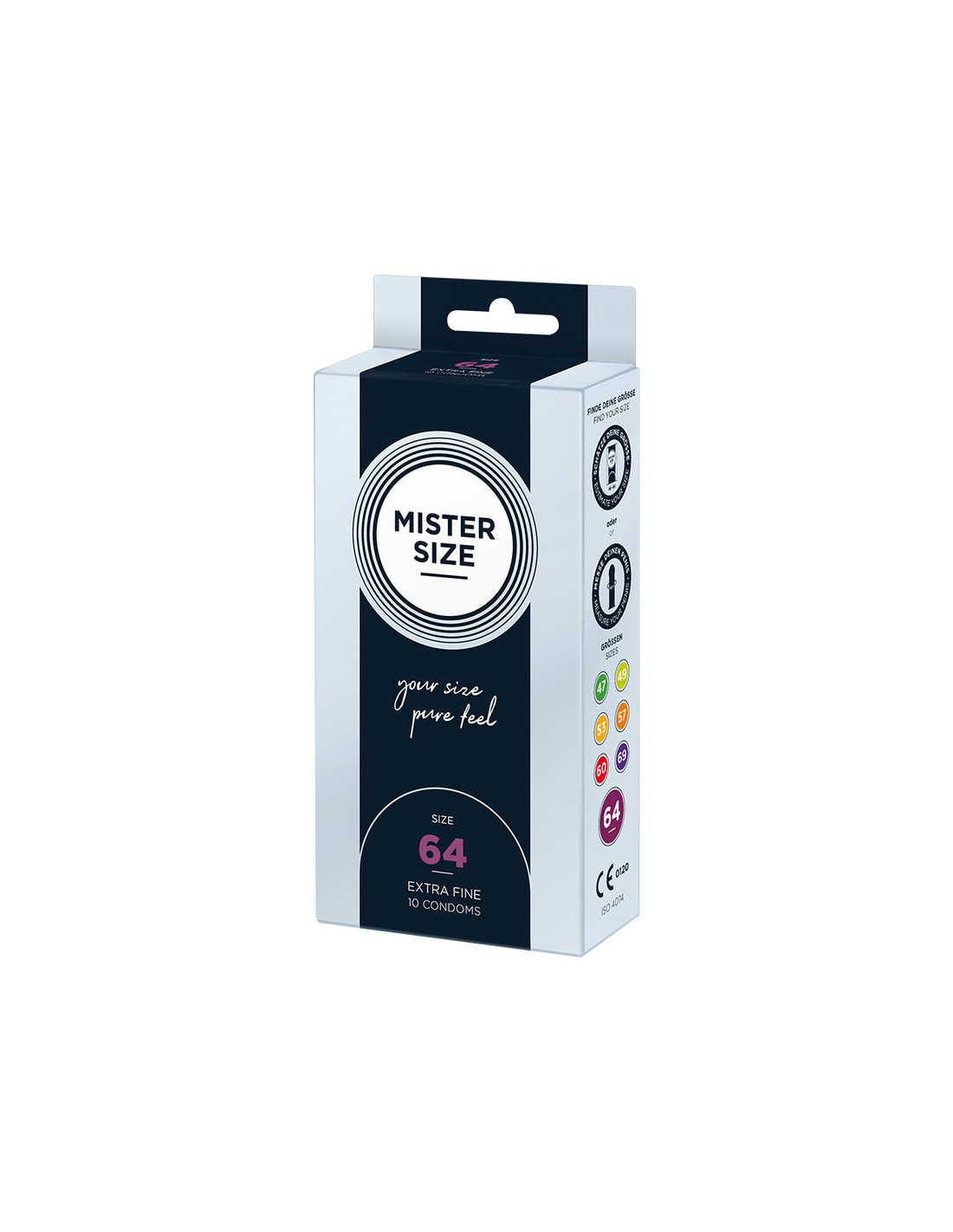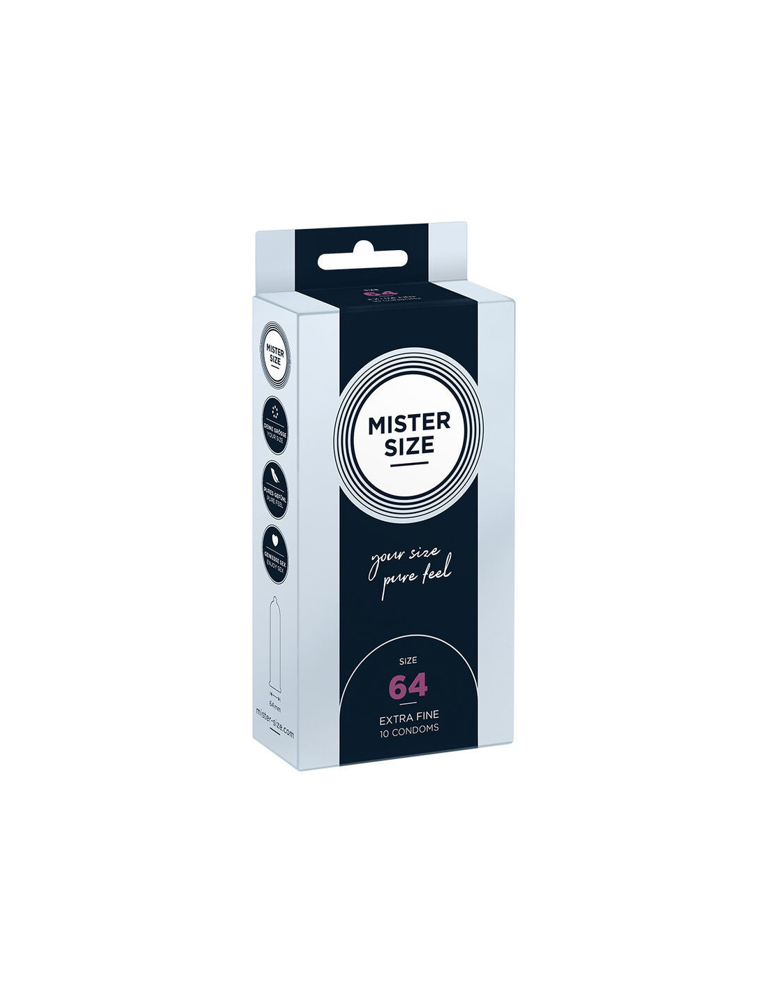 MISTER SIZESu MISTER SIZE 64 turite prezervatyvą, kuris suteikia malonų pojūtį visomis prasmėmis. Žnypštimas, gniaužimas ir jausmas, kad jūsų vyriškumas dusinamas, yra praeitis! Nuo šiol prasideda grynas malonumas. Prieš pat mylėjimąsi, sukuriama nuostabi sąjunga lengvai užtraukiant prezervatyvą ant jūsų stipraus ir tvirto varpos – sąjunga, kuri sukurs nuostabias juslinio malonumo akimirkas. Lengvas ir tobulas prigludimas prie jūsų asmeninio prezervatyvo dydžio. Kad ir kas nutiktų praeityje, prezervatyvas gali ir visada turėtų puikiai tikti! Jūsų asmeninis dydis, MISTER SIZE prezervatyvas šiltai apgaubia jūsų varpą tarsi antra oda ir sukuria natūralų pojūtį. Dabar galite atsipalaiduoti ir pagaliau visiškai atsipalaiduoti sekso metu.
