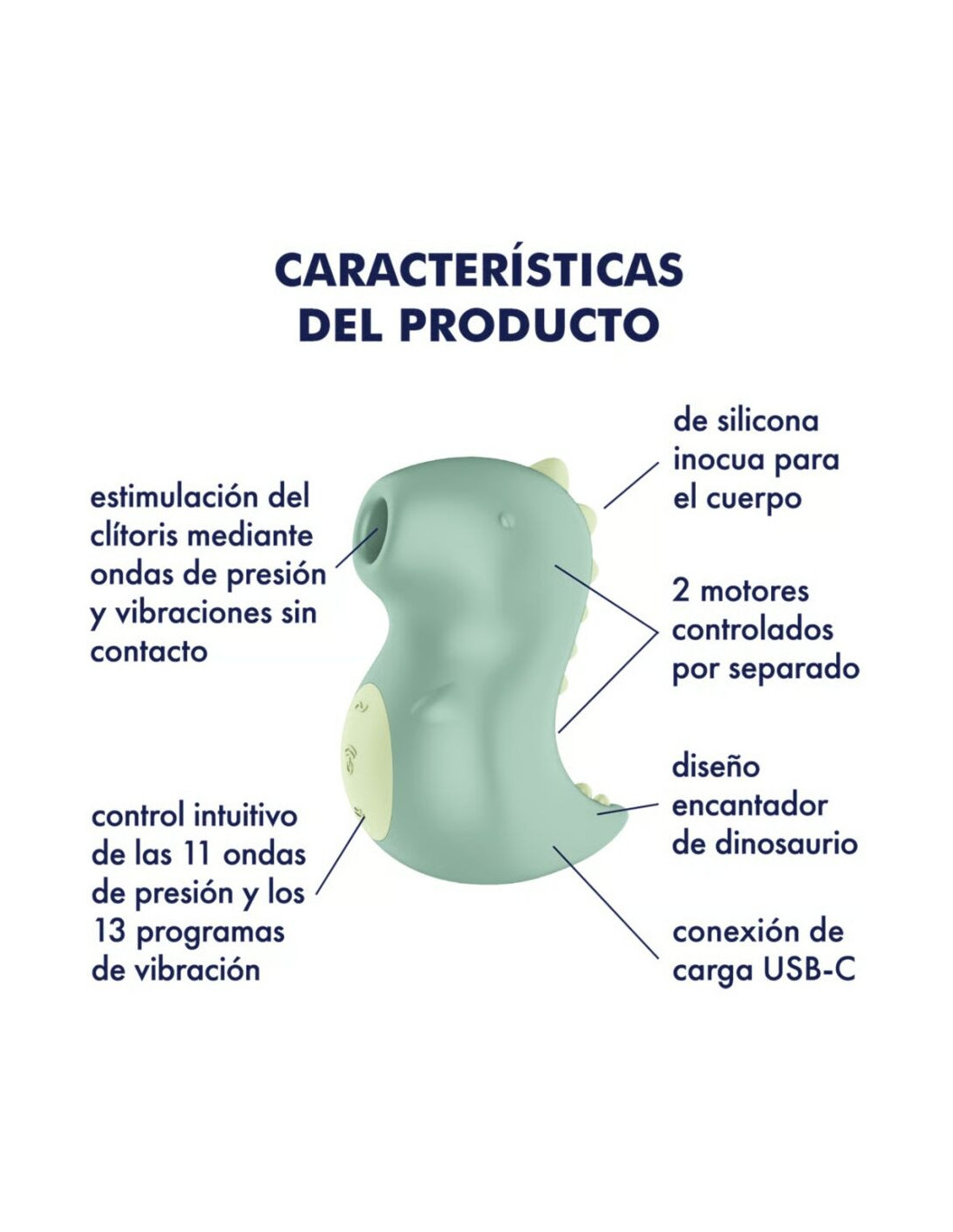 The vibrator opening gently surrounds your clitoris to create a perfect seal, providing pleasurable sensations through gentle air pulses, with or without additional vibration. You can easily recharge your new favorite toy via the USB-C port and use a drop of lubricant to enhance the sensations. And this little dinosaur isn't afraid of water either: thanks to its IPX7 waterproof finish, it's ready to join you in the shower or bath. Discover the Satisfyer Din-OOOH, a gentle air pulse vibrator for those who want to enjoy sweet dreams at the touch of a button.