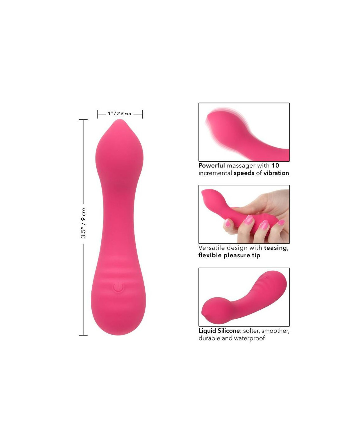 Skysto silikono „Pixies Teaser“ sukurtas suteikti jaudinantį pojūtį jūsų mėgstamiausiose malonumo vietose. Jausmingai išlenktas malonumo antgalis, dvipusis dizainas ir 10 jaudinančių vibracijos greičių paverčia šį masažuoklį puikiu kelionių kompanionu. Išlenktas masažuoklis telpa rankoje ir leidžia patirti tikslų gundymą bei jaudulį kontūruotomis vibracijomis. Žaismingai padidinkite kiekvieną 10 vibracijos greičių padidėjimą naudodami lengvai liečiamą valdymo mygtuką. Nesunkiai valdykite gryną malonumą lengvai liečiamu silikoniniu mygtuku ir palaikykite 3 sekundes, kad įjungtumėte arba išjungtumėte. Itin minkštas skystas silikonas ir unikaliai lankstus antgalis puikiai tinka lengvai tyrinėti jausmingas saldžias ir intymias malonumo vietas. Dėl lygios formos ir minkšto paviršiaus galėsite mėgautis jaudinančiomis vibracijomis bet kokiu norimu kampu. Naudokite sklandų vieno mygtuko valdymą ir mėgaukitės vibruojančiu malonumu iki 110 minučių. Įkraukite savo aistrą vos per 1,5 valandos, prijungdami pridedamą USB laidą prie savaime užsisandarinamo įkrovimo prievado masažuoklio apačioje. Dėl plono, diskretiško dydžio masažuoklis yra puikus kelionių palydovas, leidžiantis mėgautis spinduliuojančiu malonumu, kad ir kur jus nuvestų jūsų fantazijos.