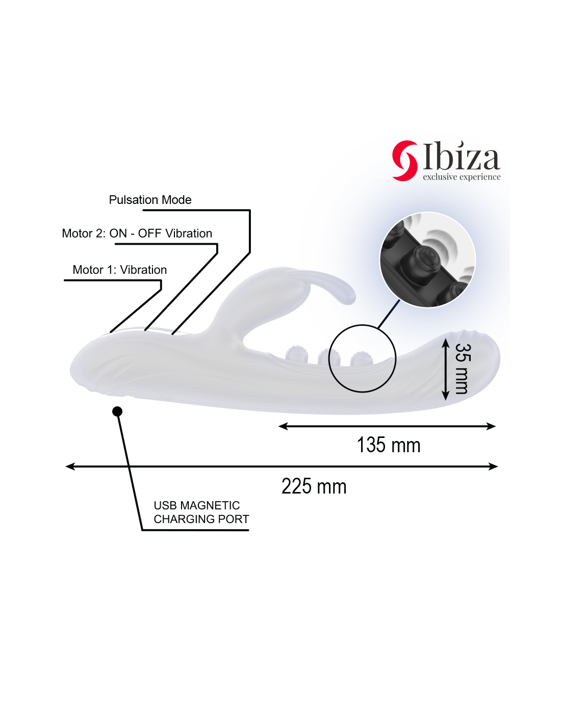 Leiskite sau pasiduoti elegantiškam dizainui ir tyliai veikiančiam IBIZA Pulsuojančio Rabbit Vibratoriaus galiai – technologiniam brangakmeniui, sukurtam malonumui tyrinėti asmeniniu, giliu ir visiškai saugiu būdu. Šis žaisliukas, sukurtas vienu metu stimuliuoti G tašką ir klitorį, sujungia ikonišką „triušio“ stilių su novatoriškomis funkcijomis, kurios privers jus vibruoti – tiesiogine prasme – nuo pirmo naudojimo.