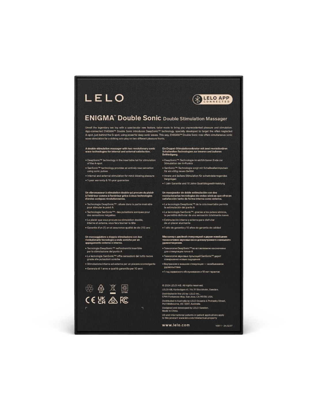 „ ENIGMA™ Double Sonic“ A taško vibratorius yra naujausias LELO ENIGMA™“ asortimento papildymas. Su juo supažindiname jus su „DeepSonic™“ technologija, kuri sutelkta į dažnai pamirštamą A tašką. Jis taip pat turi aštuonis malonumo režimus ir dar du išskirtinius programėlės valdymo režimus, kuriuos galite naudoti prisijungę prie LELO programėlės. Dėl specialaus garsinio antgalio, esančio įkišamame antgalyje, „ENIGMA™ Double Sonic“ stimuliuoja platesnę erogeninę zoną, kad giliomis garsinėmis bangomis pasiektų A tašką ir suteiktų intensyvesnius vaginalinius orgazmus. Jis taip pat siunčia garsines bangas į klitorį, taip pat vibracijas į G tašką.