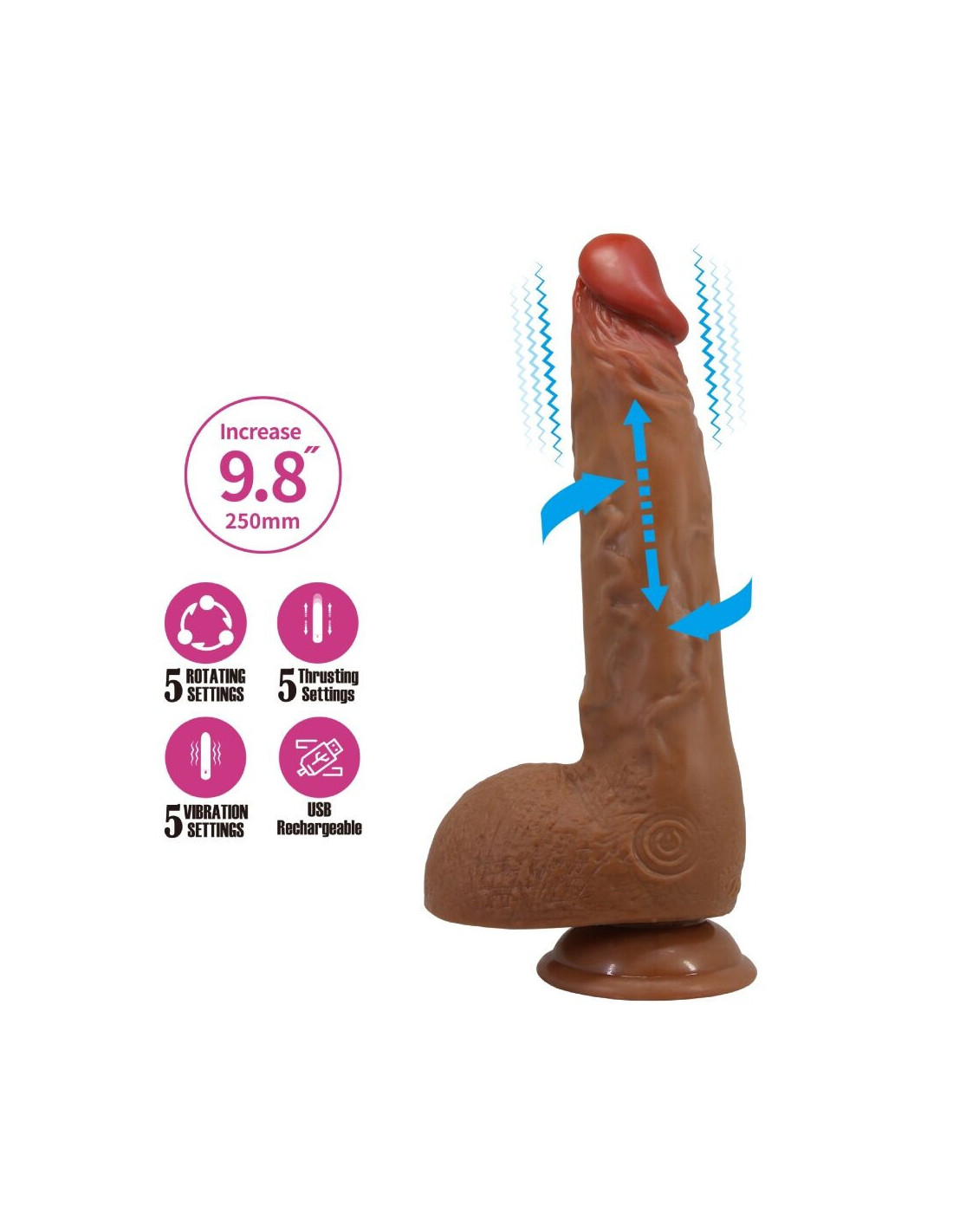 - Funkcijos: 5 vibracijos funkcijos, 5 sukimosi funkcijos, 5 stūmimo nustatymai