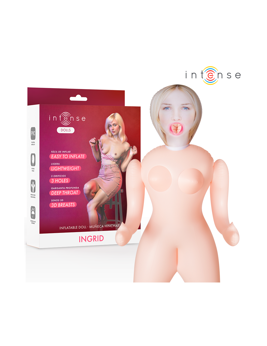 Lėlė turi tris nepriklausomas malonumo zonas: makštį, išangę ir gilų gerklės burną, kurių kiekvienos vidinė struktūra sukurta taip, kad suteiktų skirtingus pojūčius. Šis universalumas leidžia jums tyrinėti ir mėgautis skirtingomis patirtimis, priklausomai nuo momento ar jūsų norų. Be to, Ingrid yra lengva ir lengvai pripučiama, todėl ją lengva transportuoti, laikyti ir naudoti. Jos atspari vandeniui struktūra leidžia jums mėgautis ja drėgnoje aplinkoje ir supaprastina valymą po naudojimo. Realistiškos 3D krūtys suteikia natūralesnę ir malonesnę tekstūrą liesti, užbaigdamos labai patenkinamą jutiminę patirtį.