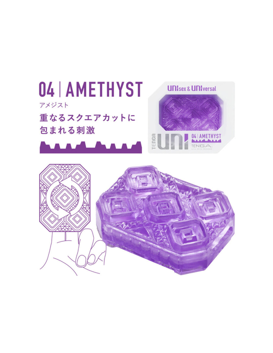 TENGA UNI“ pagamintas iš minkštos, tamprios medžiagos, todėl galite jį nešioti ant piršto ir uždėti ant moteriškų lytinių organų arba apversti ir apvynioti aplink vyriškus lytinius organus. Be to, tai visiškai naujas TENGA su unisex ir universaliu dizainu, kuriuo galite džiaugtis ne tik jūs, bet ir jūsų partneris.