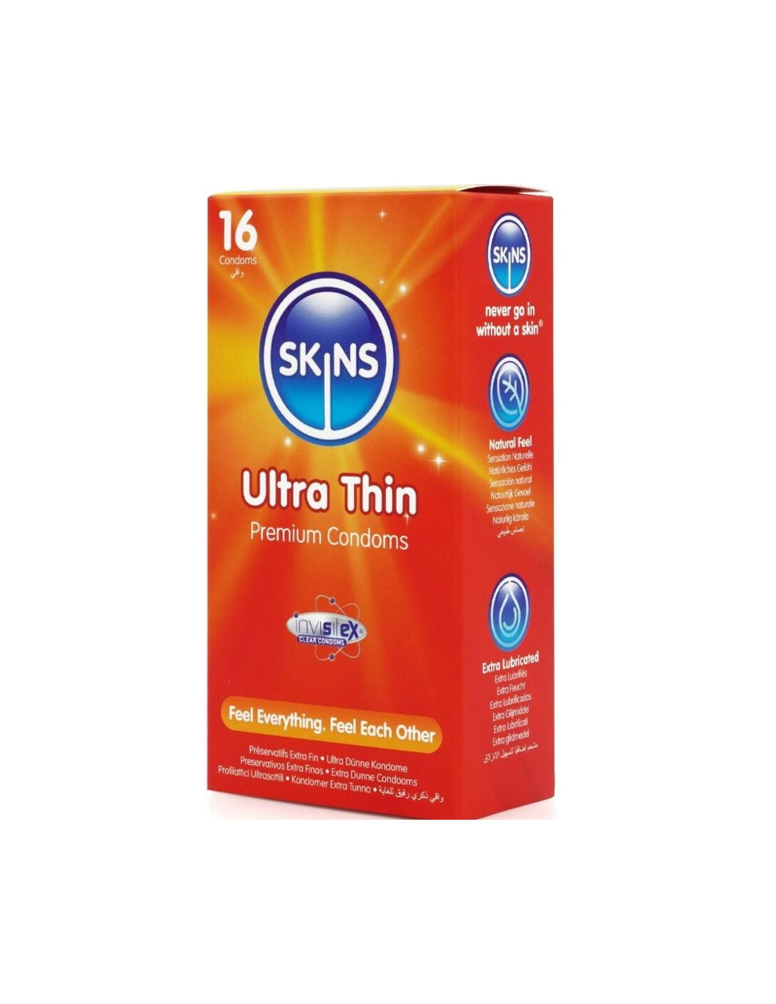 SKINSPristatome „Skins Ultra Thin“ 16 vnt. pakuotėje – tai už prieinamą kainą pagamintas, paruoštas naudoti produktas, kuriame yra iki 33 % daugiau prezervatyvų nei rinkos lyderio pakuotėje. Ši pakuotė, sukurta klientams, ieškantiems visiško intymumo ir patikimos apsaugos, idealiai tinka mažmenininkams, ieškantiems aukščiausios kokybės, didelio našumo būtinybės. „Skins Ultra Thin“ prezervatyvai pasižymi visais „Skins Natural“ privalumais, tačiau yra dar plonesni, kad pojūtis būtų dar intymesnis. Pagaminti iš aukščiausios kokybės natūralaus latekso, jie yra tvirti, skaidrūs ir tarsi antra oda, todėl tai idealus pasirinkimas tiems, kuriems svarbiausia pojūčiai. Jauskitės dar arčiau savo partnerio su „Skins Ultra Thin“ prezervatyvu – stipriu, bet neįtikėtinai plonu. Turėdamas visas „Skins Natural“ savybes, bet dar plonesnį, „Skins Ultra Thin“ dėvėjimas jaučiasi kaip antra oda.