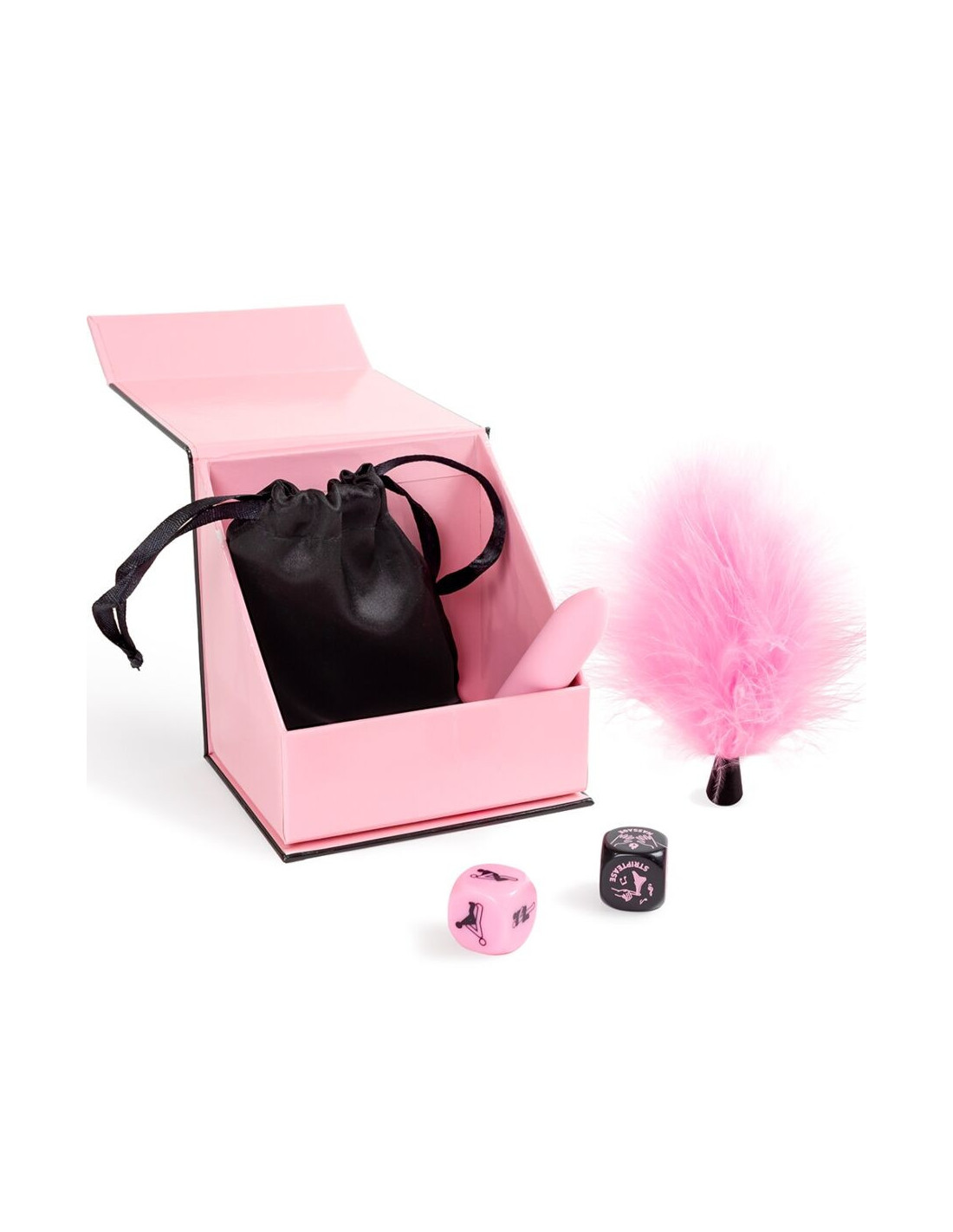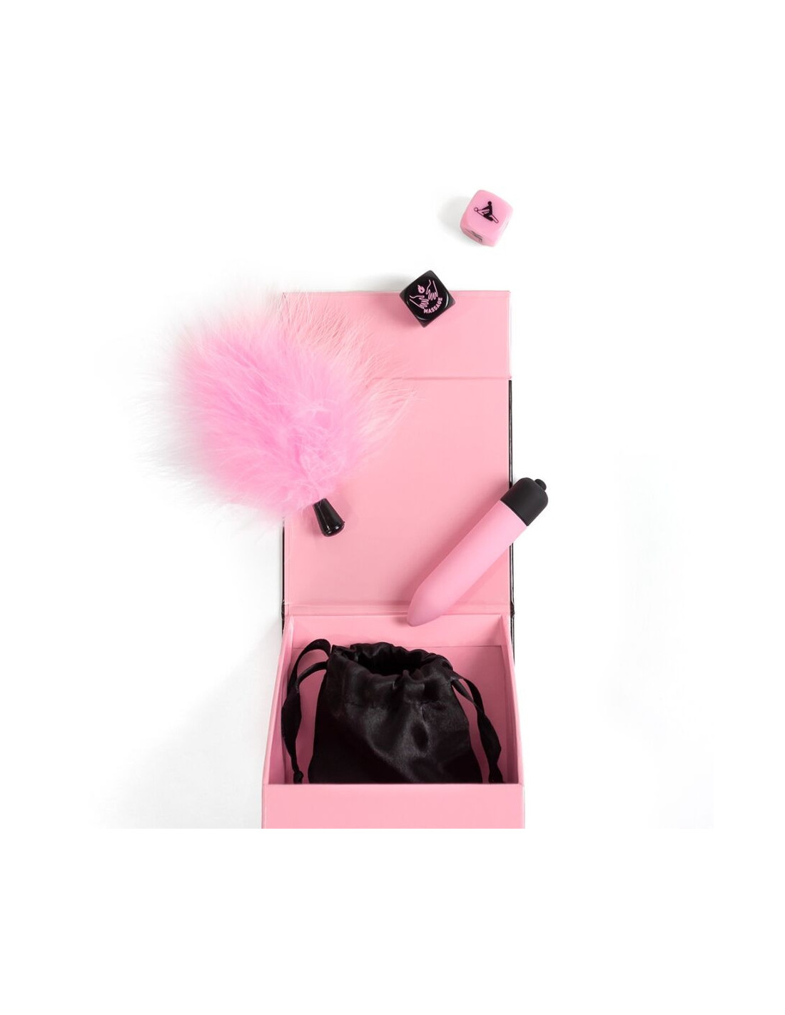 SECRETPLAY 100% GAMESSecret Pleasures Box es el kit ideal para regalar momentos de placer a tu pareja. Su contenido es muy completo y no solo vibrarás de placer con su balita vibradora, también podrás disfrutar de unas caricias muy seductoras con su plumero rosa de tacto suave y jugar con sus 2 dados que al lanzarlos tienen funciones muy diferentes.