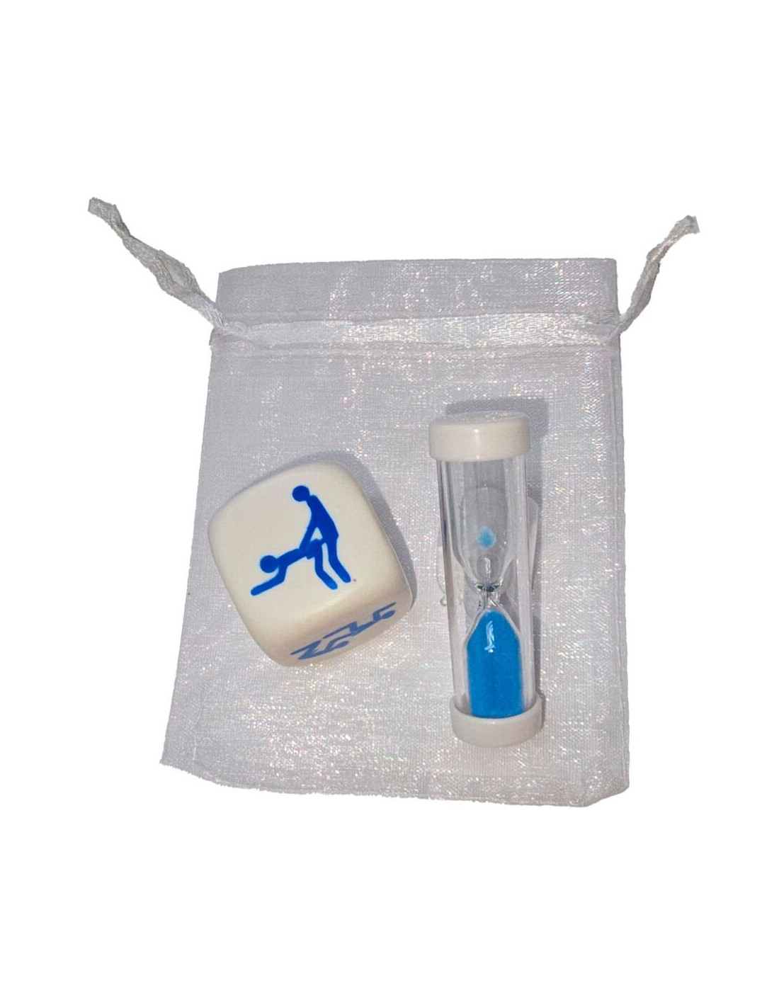 AUKŠTOS KOKYBĖS KIETI BALTI 25 MM KAULIAI IR 2 MINUČIŲ SMĖLIO LAIKRODIS, kuris žymės ištraukiamos POSŪROS laiką. Jie supakuoti permatomame šilko maišelyje.