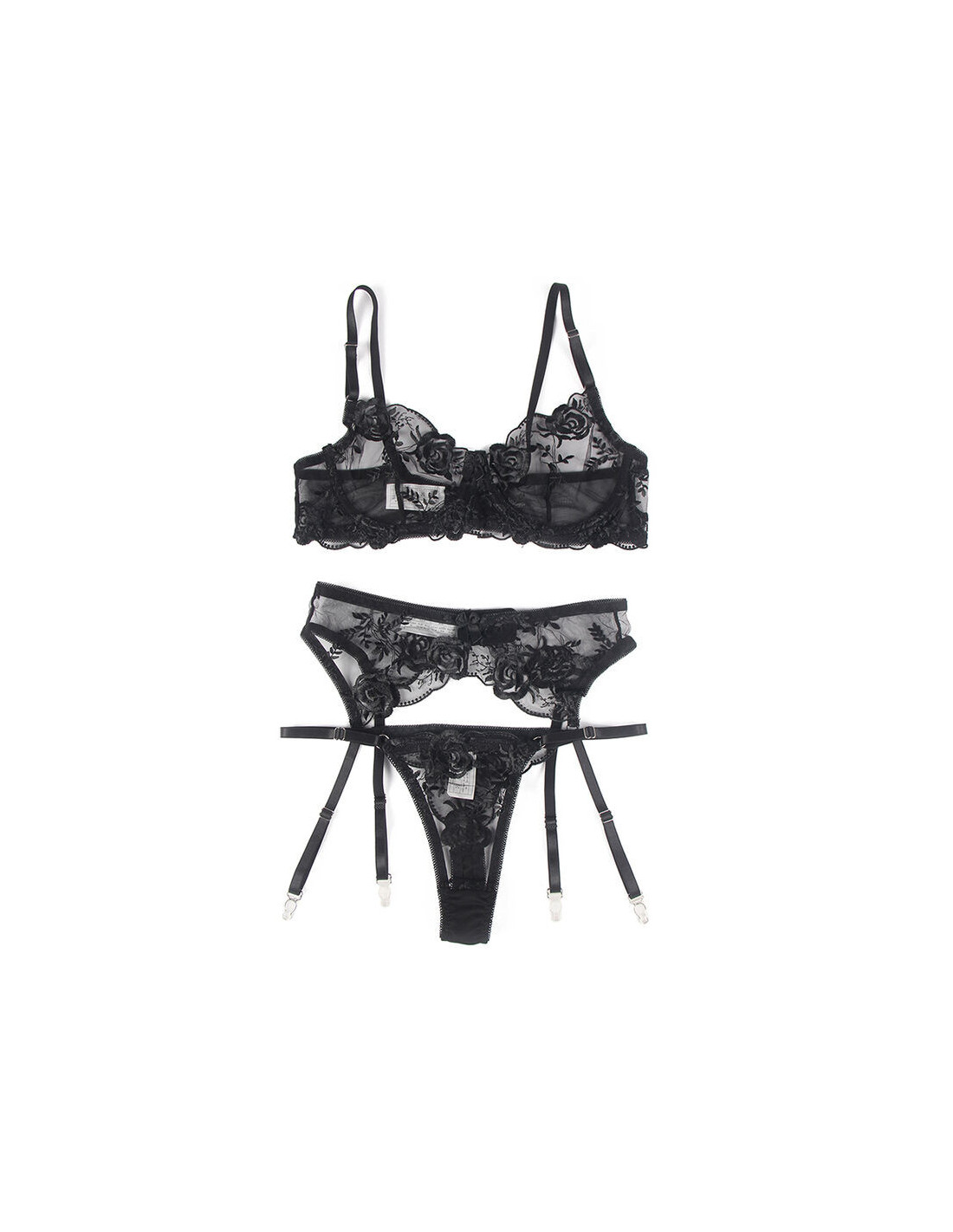 SUBBLIME - 3 dalių liemenėlės ir kelnaičių rinkinys su gėlių raštu, juodas S-M