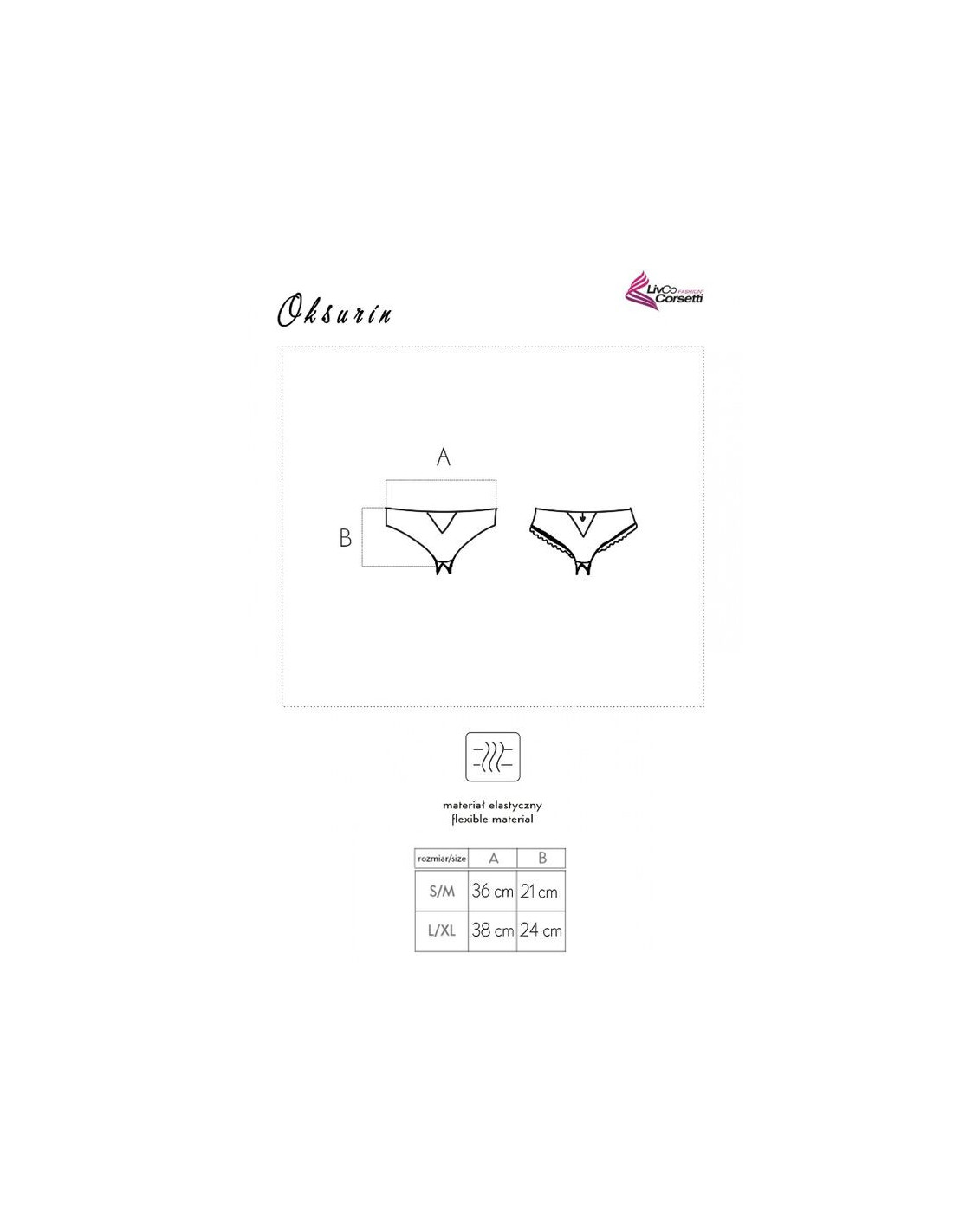 Šis kelnaičių modelis yra itin drąsus, nes tai kelnaitės su atvira išeiga, kurios yra itin seksualios ir moteriškos. „Oksurin“ kelnaitės turi mažą skylutę priekyje ir šiek tiek didesnę gale, kurią vainikuoja ryškus ir blizgus tūkstančių spalvų širdies formos kristalas. Erotiniai apatiniai suteikia puikias galimybes įvertinti save kaip moterį ir pabrėžti savo seksualumą. Tiesa, atviros kelnaitės yra šiek tiek drąsesnės, palyginti su tradiciniais modeliais, tačiau verta jas išbandyti ir pamatyti patiems. Kiekviena moteris turėtų turėti tokį modelį savo spintoje. Kelnaitės geriausiai parodo ir pabrėžia moteriškas formas, todėl tikrai pasijusite antgamtiškai.