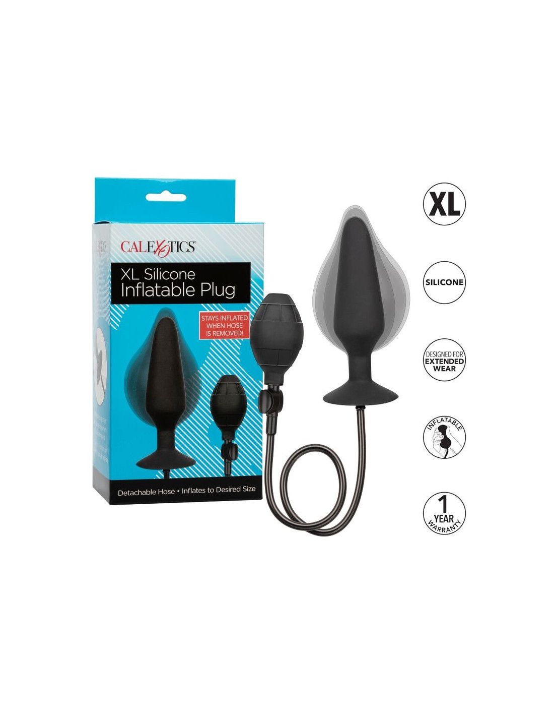 CALEXOTICS„CalExotics XL“ silikoninis pripučiamas kaištis yra unikalus analinis zondas su pripučiamu korpusu, lengvai spaudžiama lempute ir nuimama žarnele.