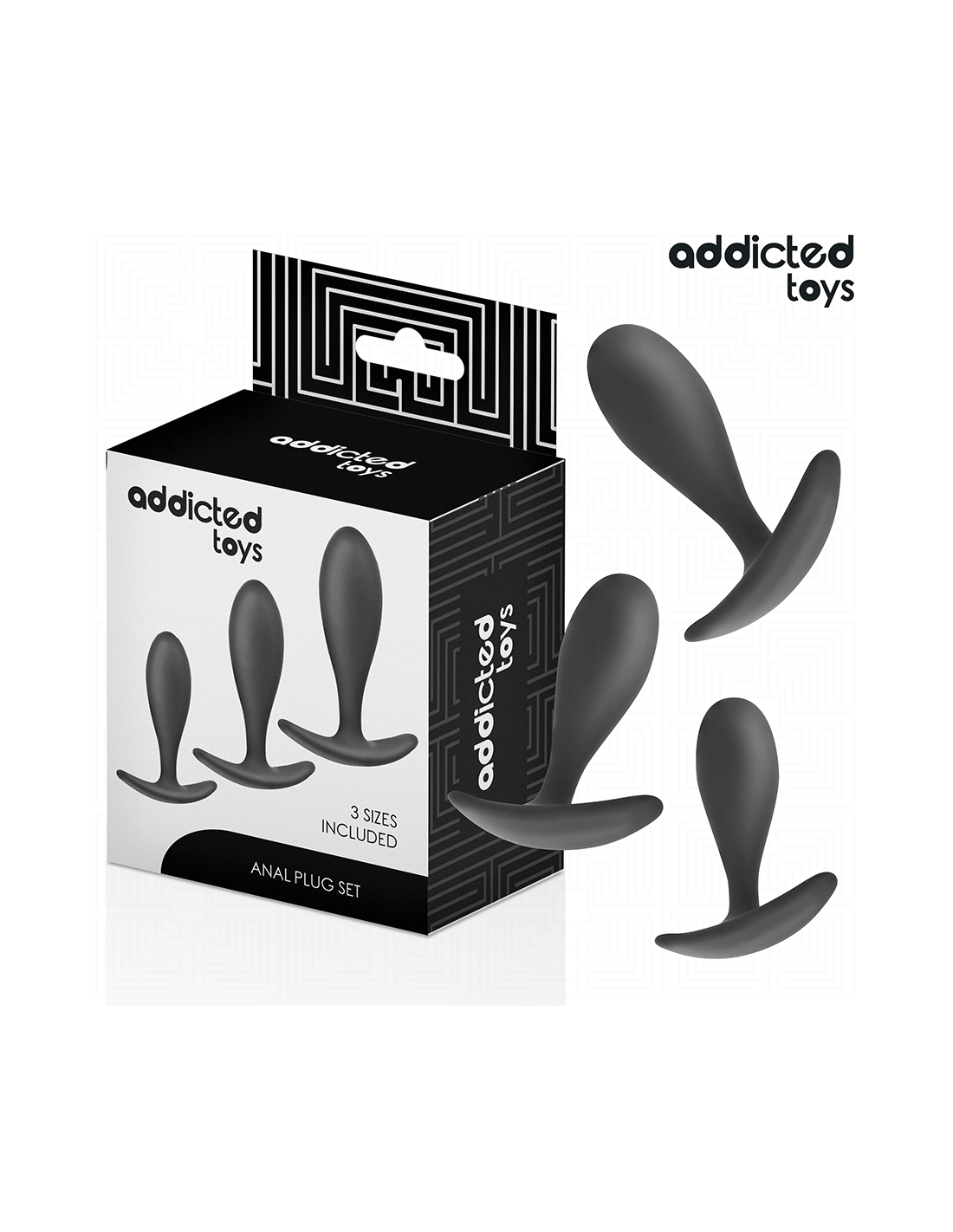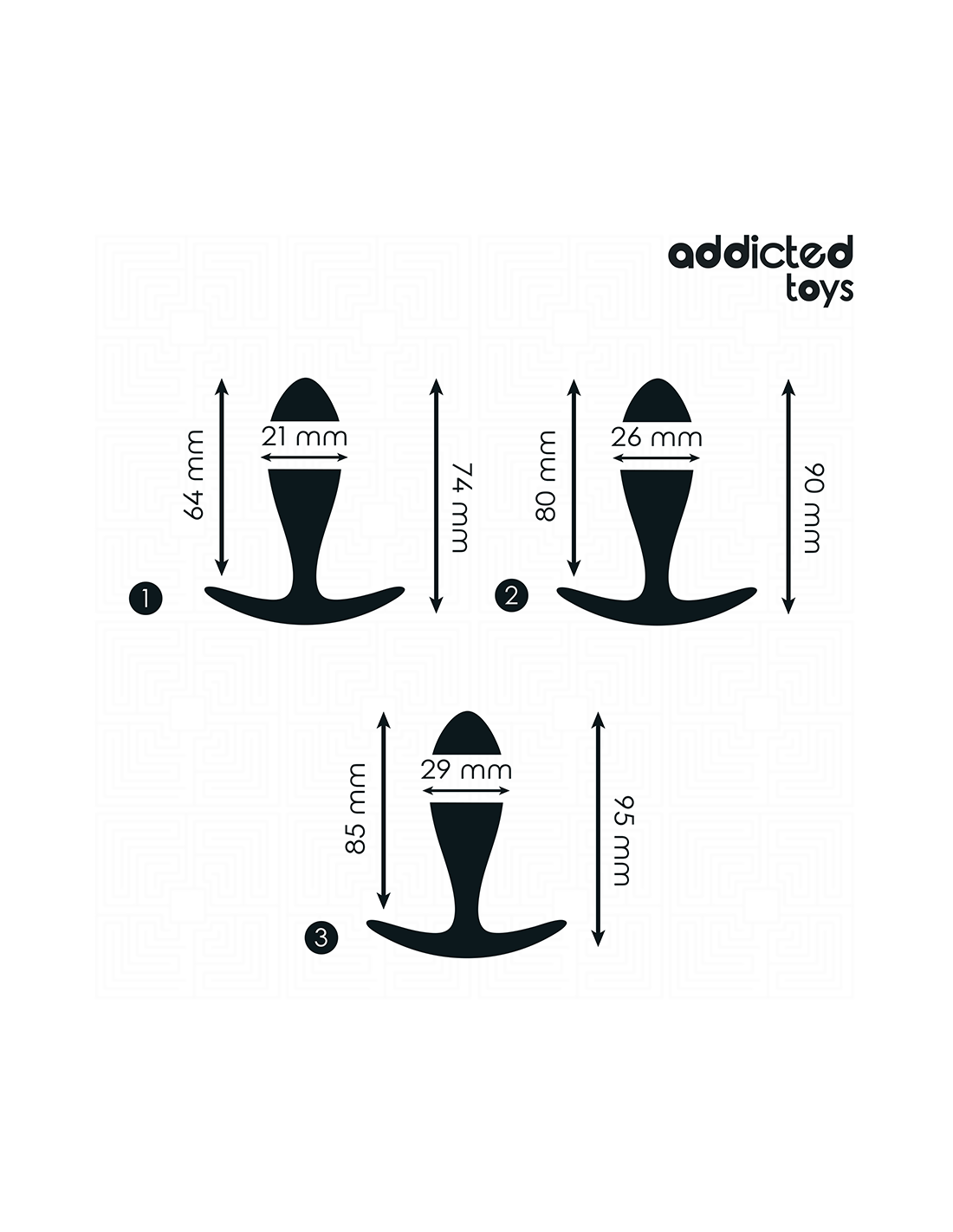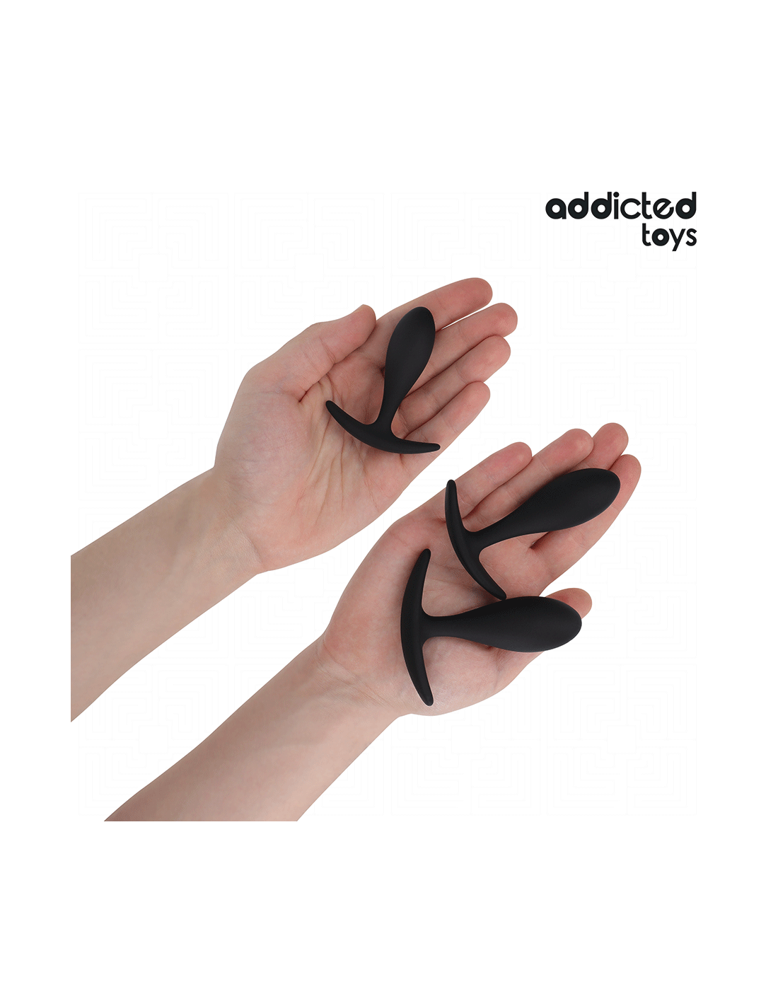 ADDICTED TOYSŠiame rinkinyje yra trys skirtingo dydžio analiniai kaiščiai, leidžiantys palaipsniui prisitaikyti skirtingo lygio naudotojams – nuo pradedančiųjų iki labiau patyrusių žmonių. Kiekvienas kaištis yra lygaus ir išlenkto dizaino, todėl jį lengva ir patogu įdėti. Inkaro formos pagrindas užtikrina saugumą ir patogumą, apsaugo nuo per didelio įkišimo ir leidžia lengvai išimti.
