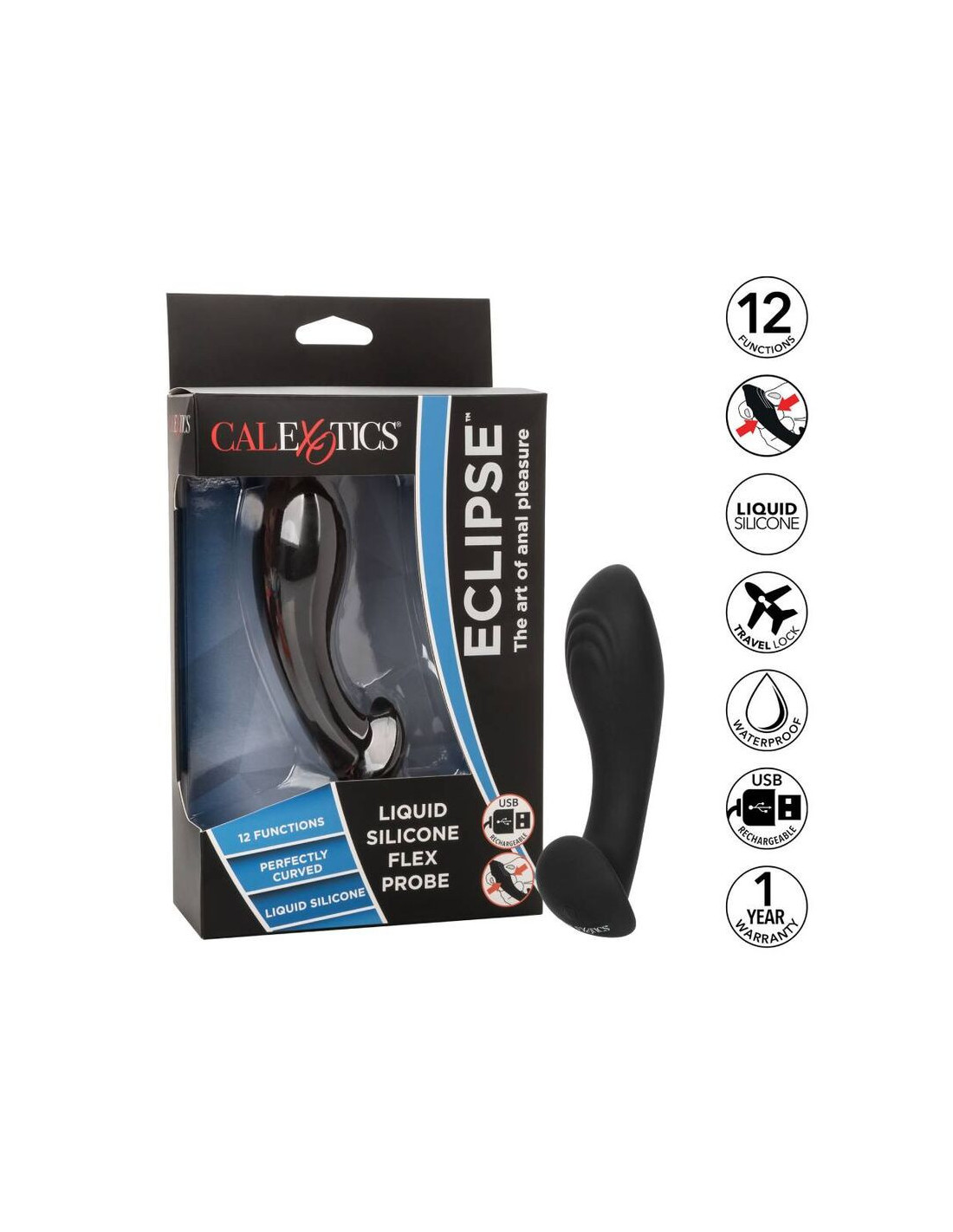 „Eclipse“ skysto silikono „Flex Probe“ zondas yra seksualus, lankstus silikoninis zondas, sukurtas tam, kad palengvintų jaudinantį analinį malonumą. Švelniai išlenktas dizainas ir minkštas skystas silikonas leidžia šiam zondui lankstytis kartu su jūsų judesiais ir suteikti intensyvią stimuliaciją. Šis jausmingai briaunotas zondas pagamintas iš ypač minkšto silikono, kad būtų užtikrintas unikaliai patogus malonumo žaidimas. Galingas vibracijos variklis kotedže atlieka 12 intensyvių dundančios užpakalinių durelių stimuliacijos funkcijų, o kontūruotas pagrindas ir lankstus korpusas lankstosi ir juda net ir pačiomis X reitingo akimirkomis. Mėgaukitės patogiu įdėjimu, lengva stimuliacija ir švelniu išėmimu su ergonomiška forma, lanksčiu dizainu ir išlenktu pagrindu. Įkraukite aukščiausios kokybės skysto silikono masažuoklį per 1,5 valandos naudodami pridedamą USB įkrovimo laidą ir mėgaukitės 110 minučių mažo greičio stimuliacija arba 55 minutes didelio greičio vibracija. Nors paprastas mygtukas kontroliuoja intensyvumą, o minkštas zondas suteikia norimą stimuliaciją, integruotas modernus atminties lustas prisimena, kaip jums patinka, paleisdamas paskutinę naudotą funkciją.