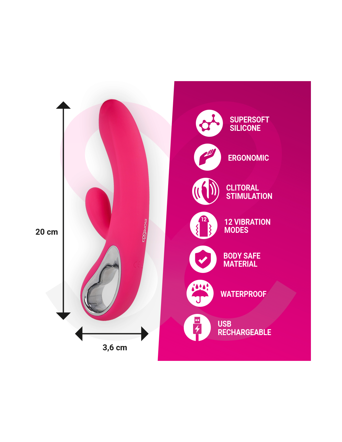 „Moressa“ yra etalonas savo dizainu, kokybe ir technologijomis. Sukūrėme novatorišką produktą ir pasirūpinome kiekvienu gamybos procesu, kad pasiektume geriausią rezultatą. „Moressa“ yra energijos, stiprybės ir garantijos simbolis. Įsigydami sekso žaisliuką „Moressa“, jaučiatės atspindėti šiandienos naujienose. Kiekvienas „Moressa“ žaisliukas nukels jus į skirtingus pojūčius. Neprilygstamas rezultatas dėka patogaus aukščiausios kokybės silikono ir ergonomiško dizaino.
