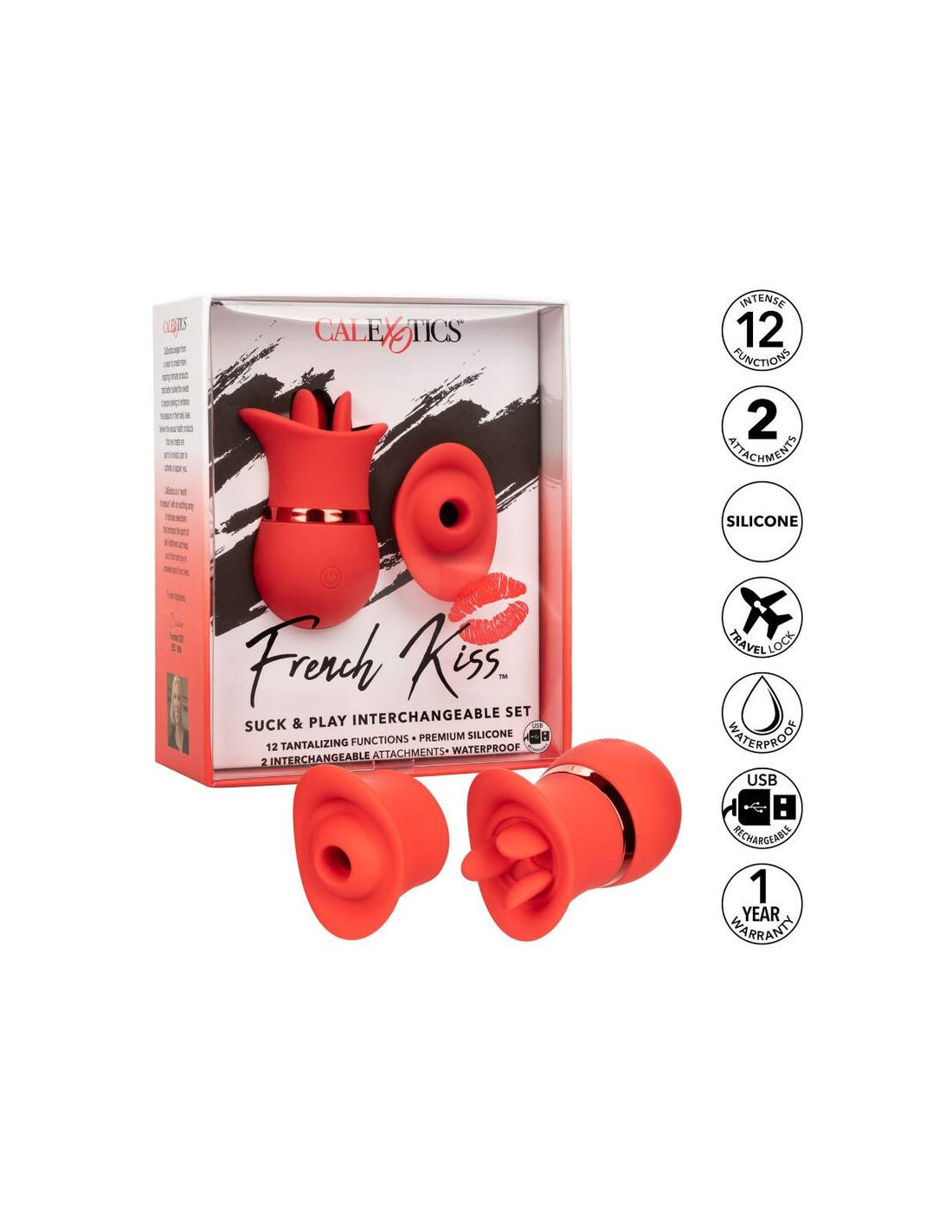 Dvigubas malonumas, o vau! Šis jausmingas keičiamas prancūziško bučinio spenelių rinkinys yra būtent tai, ko jums reikia, su 2 keičiamais priedais, turinčiais 12 vibracijos arba 12 siurbimo funkcijų. Pilno kontakto kaušelis ir trigubas liežuvio virpėjimo stimuliatorius sukurti taip, kad tobulai prisitaikytų prie jūsų intymiausių malonumo taškų, naudojant 12 intensyvių funkcijų. Įsijunkite jausmingai suformuotą varpos čiulpiklį ir mėgaukitės 12 jaudinančio čiulpimo funkcijų arba pasinerkite į tikrą prancūzišką bučinį su 12 mirksėjimo funkcijų. Minkštas, lankstus silikonas ir jausmingai suformuotas korpusas leidžia suteikti atpažįstamą malonumą beveik iš bet kokio kampo. Naudokite patogų lietimui jautrų mygtuką, kad valdytumėte malonumą iki 50 minučių. Įkraukite savo malonumą vos per 1 valandą naudodami pridedamą USB laidą, įkištą į masažuoklio automatiškai pasirenkamą įkrovimo prievadą. Diskretus mini masažuoklio dydis ir kelioninis užrakinimo mygtukas paverčia jį puikiu kelionių palydovu, leidžiančiu mėgautis spinduliuojančiu malonumu, kad ir kur jus nuvestų jūsų fantazijos.