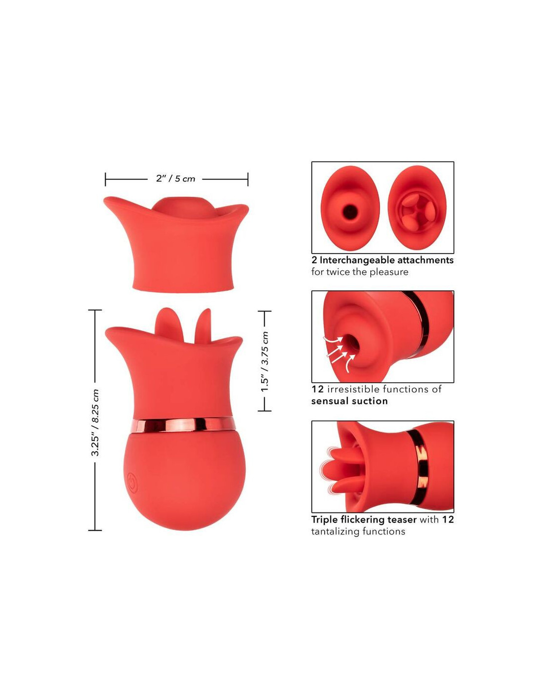 - Jausmingą rinkinį sudaro 2 keičiami priedai, skirti dvigubam mirksėjimo malonumui: trigubai mirksintis erzinantis žaisliukas su 12 funkcijų