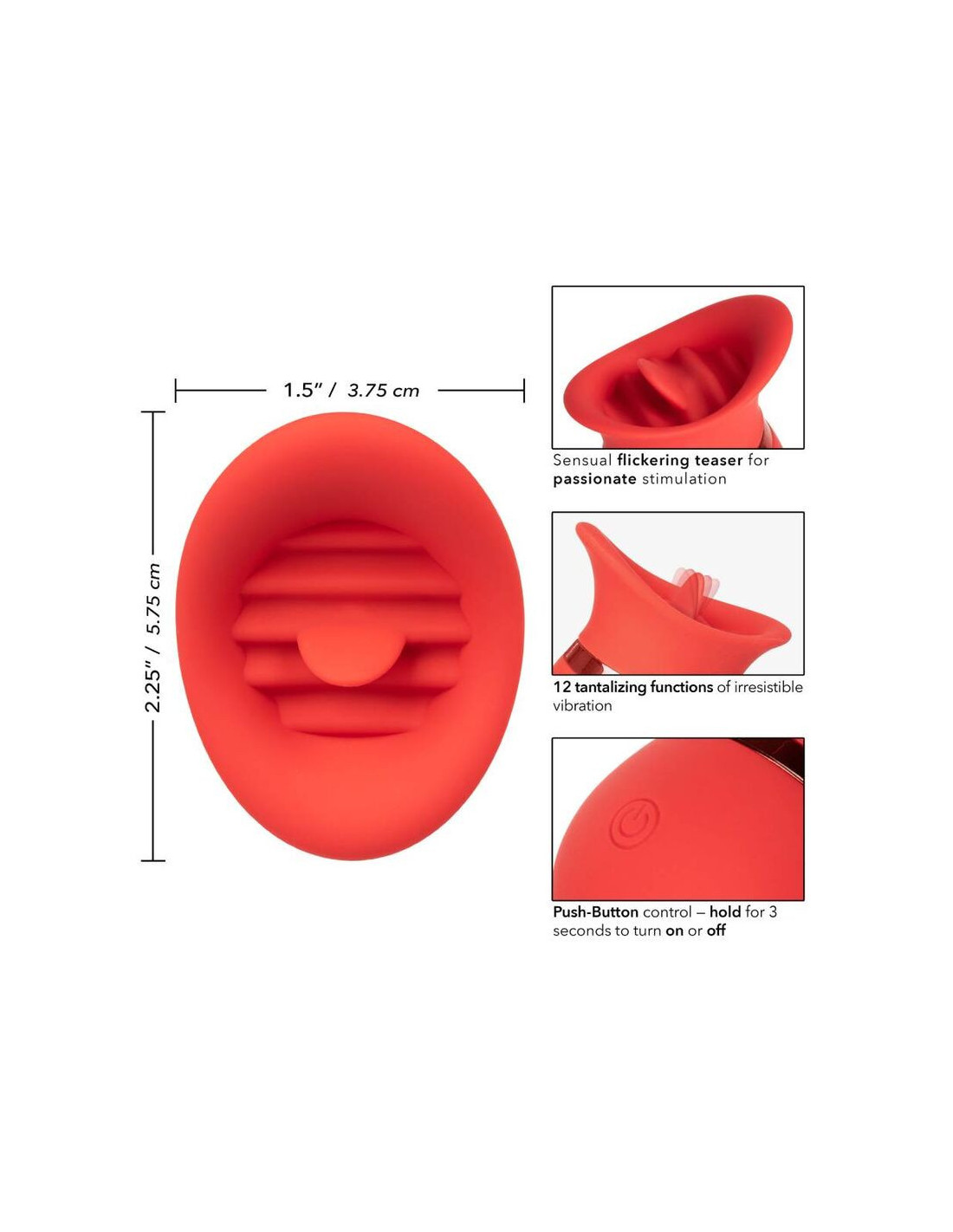 Jausmingas „French Kiss Sweet Talker“ pasiruošęs įsprausti į jūsų rankinę ar kelioninį krepšį orgazminiam malonumui kelyje. Kompaktiškas masažuoklis telpa vos tarp pirštų ir suteikia galingą mirgantį malonumą, atlikdamas 12 jausmingų mirgančio judesio funkcijų per liežuvį primenantį galiuką. Pilnai kontaktinis kaušelis ir plazdenantis liežuvio erziklis sukurti taip, kad tobulai prisitaikytų prie intymiausių malonumo taškų. Minkštas, elastingas silikonas ir jausmingai suformuotas korpusas leidžia patirti gryną malonumą beveik iš bet kurio kampo. Naudokite lengvai liečiamą mygtuką, kad valdytumėte iki 50 minučių vibruojančio malonumo mažu greičiu ir 35 minutes dideliu greičiu. Įkraukite savo malonumą vos per 75 minutes, prijungdami pridedamą USB laidą prie masažuoklio savaiminio atsistatymo įkrovimo prievado. Mini masažuoklio diskretiškas dydis ir kelioninio užrakto mygtukas paverčia jį puikiu kelionių palydovu, leisdami mėgautis spinduliuojančiu malonumu, kad ir kur jus nuvestų jūsų fantazijos.