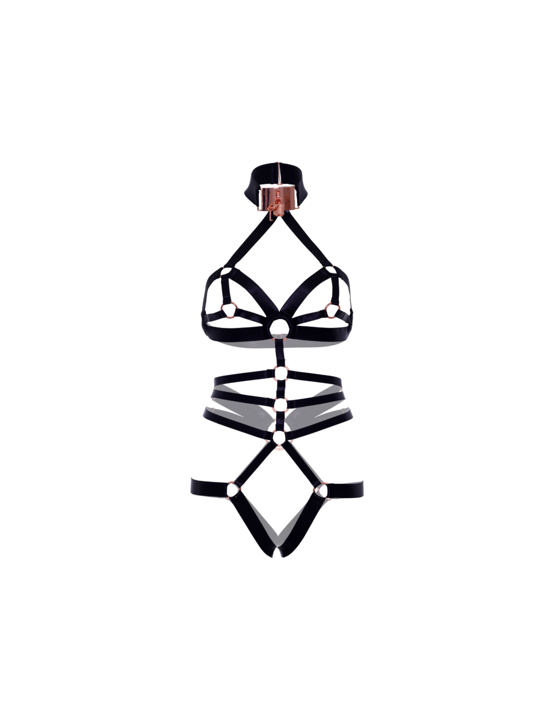 Pasilepinkite geismu su mūsų atlasiniu, tampriu, be tarpukojo eskiziniu žiedu. Su reguliuojamais dirželiais, rožinio aukso spalvos užsegimu ir rakto formos kaklu, šis provokuojantis kostiumas įžiebia aistrą ir paklusnumą. Išlaisvinkite savo vidines fantazijas su šiuo gundančiu elegancijos ir žavesio deriniu, kuris kiekvieną akimirką pavers nepamirštama.