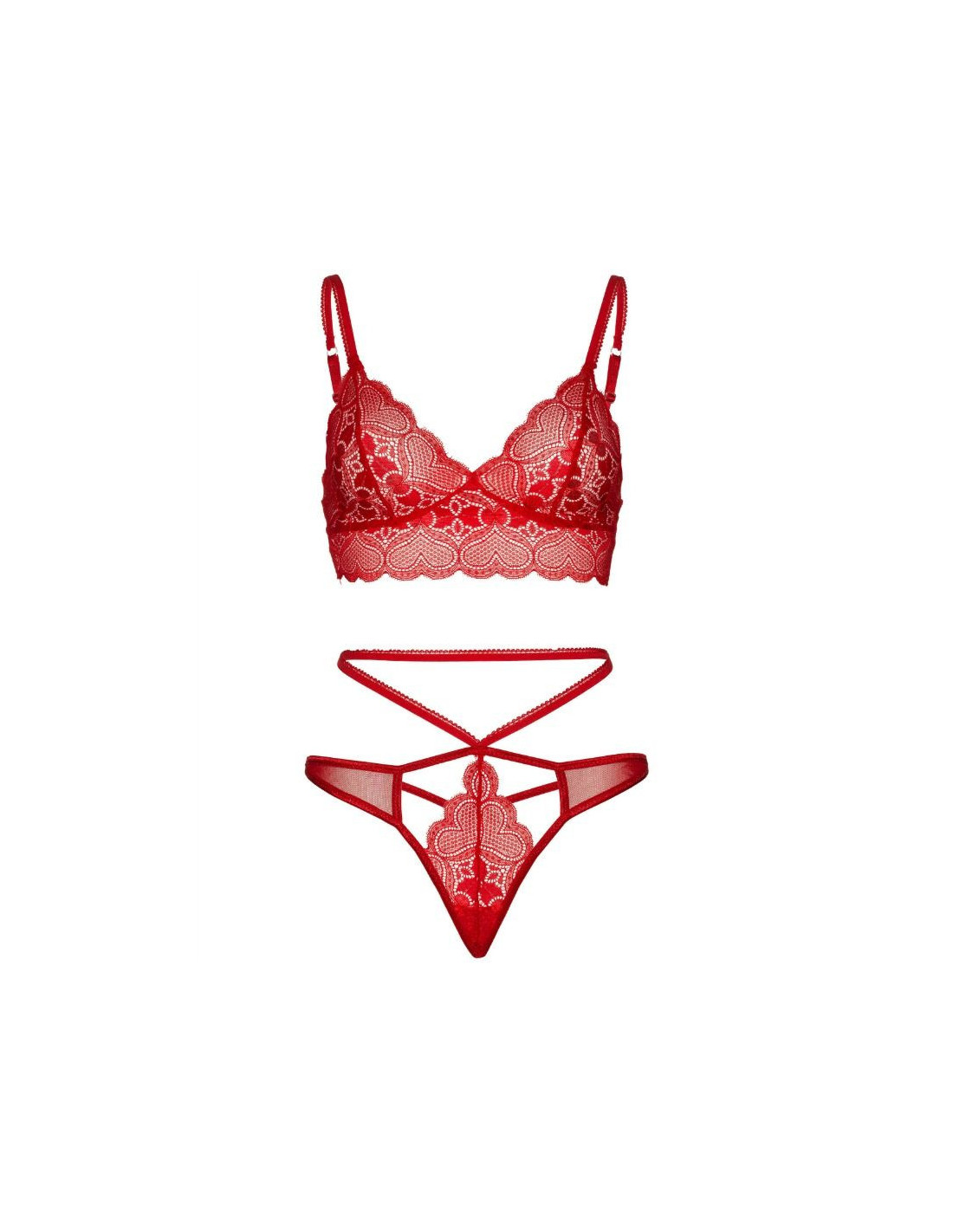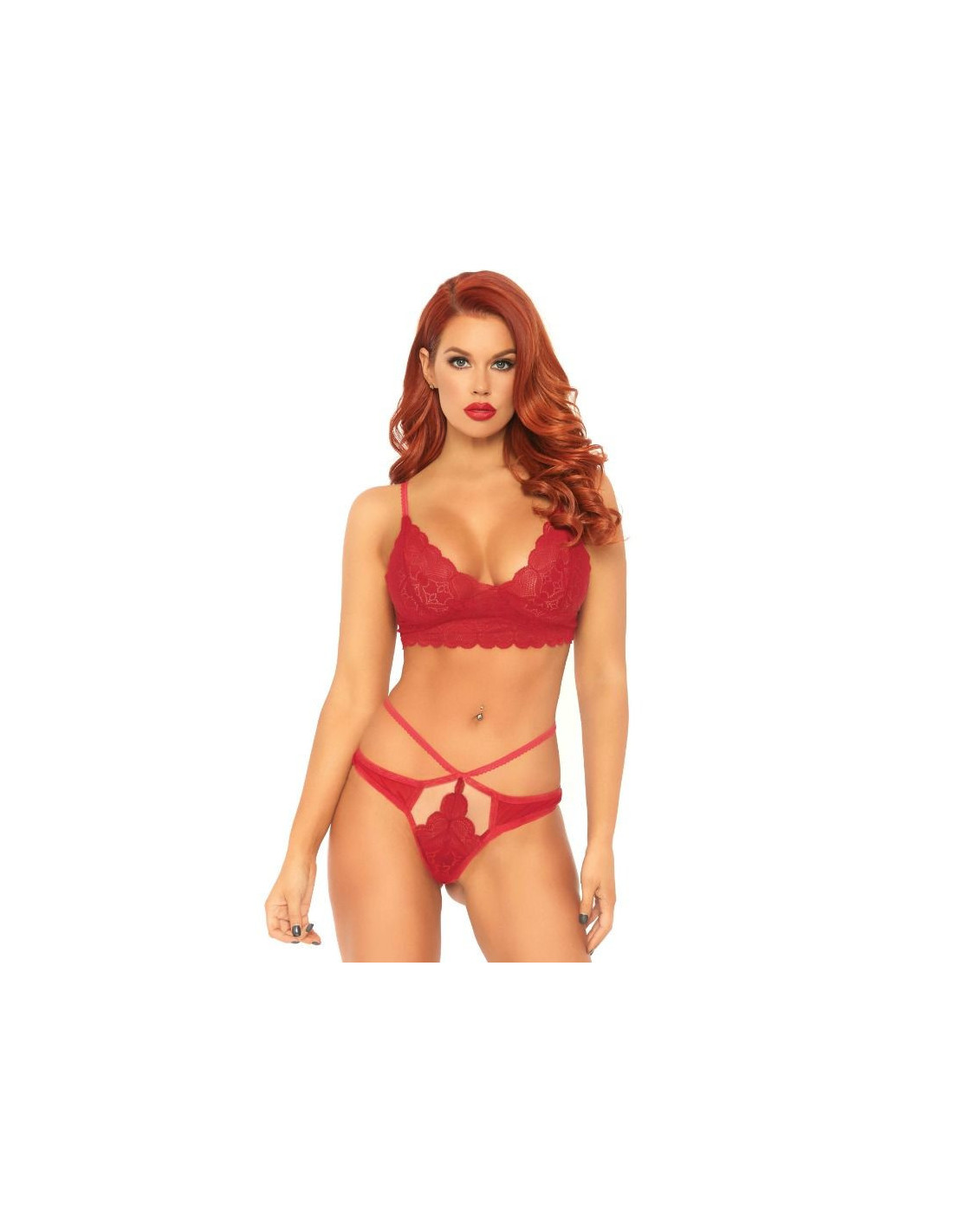 Dviejų dalių „Sweetheart“ nėriniuota liemenėlė ir derančios kelnaitės su iškirptomis petnešėlėmis. Pajuskite gundymo galią su mėgstamiausiu apatinio trikotažo prekės ženklu: „Leg Avenue“.