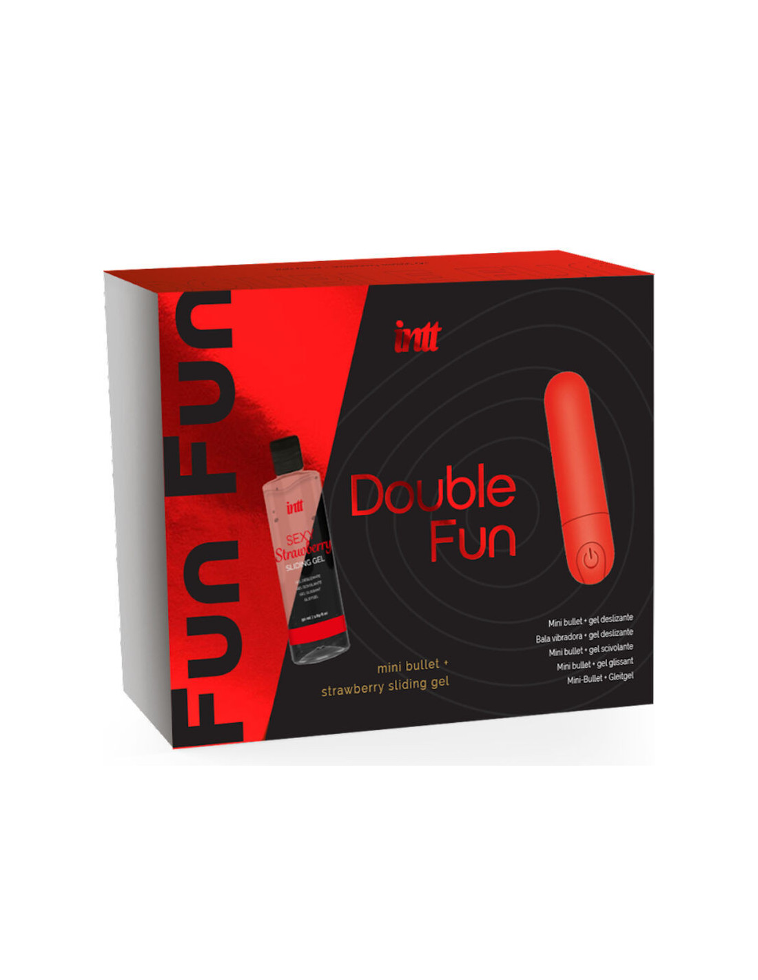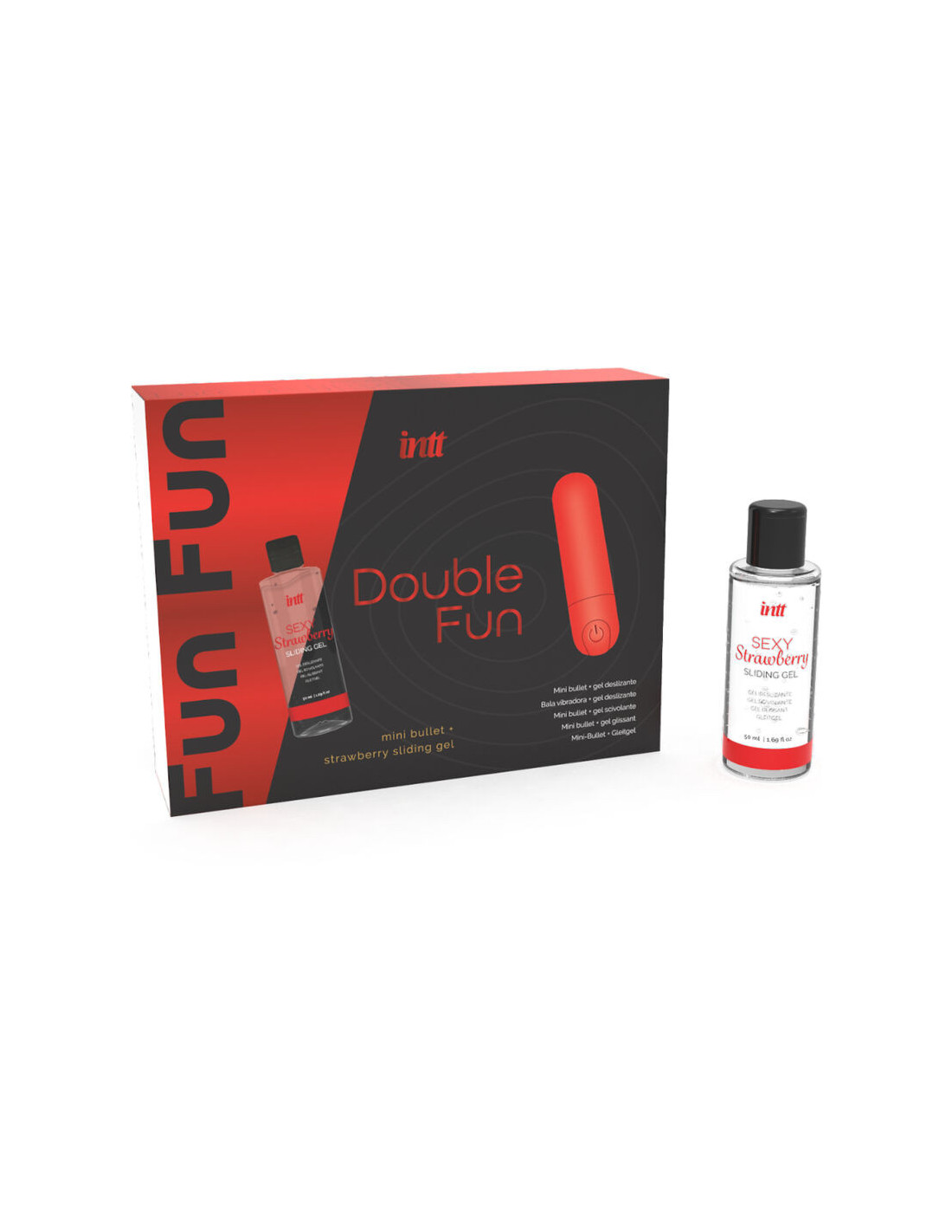 „INTT Double Fun“ – tai rinkinys, kuriame yra vibruojanti kulka ir braškių skonio vandens pagrindo gelis. Idealus rinkinys savęs malonumui ar erotiniams žaidimams kompanijoje.