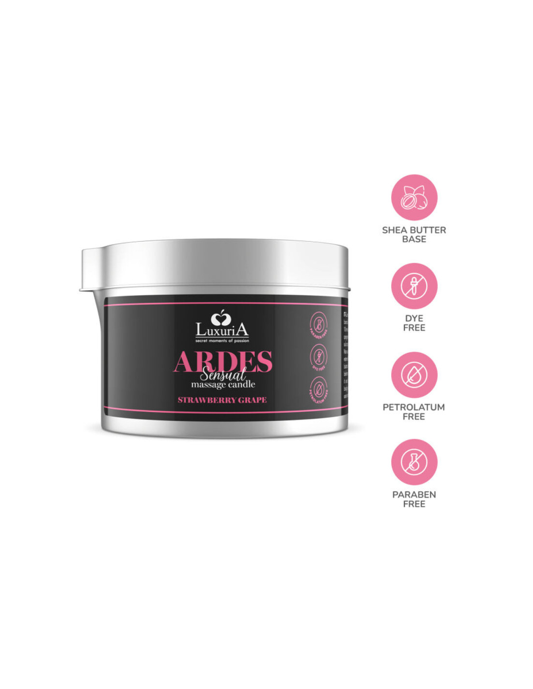 „Luxuria Ardes“ vynuogių/braškių masažinė žvakė – tai kvapni masažinė žvakė, pagaminta su taukmedžio sviestu, praturtinta jausmingais aromatais, kurie sustiprina ir stimuliuoja intymius santykius. Stangrinančios ir minkštinančios taukmedžio sviesto savybės suteiks jūsų odai palengvėjimą ir švelnumą. Svaigus kvapų aromatas apgaubs jus šiltomis ir jausmingomis akimirkomis, kupinomis aistros ir jaudulio. „Ardes“ uždegs geidulingą atmosferą, nukels jus į juslinį erotinio malonumo matmenį.