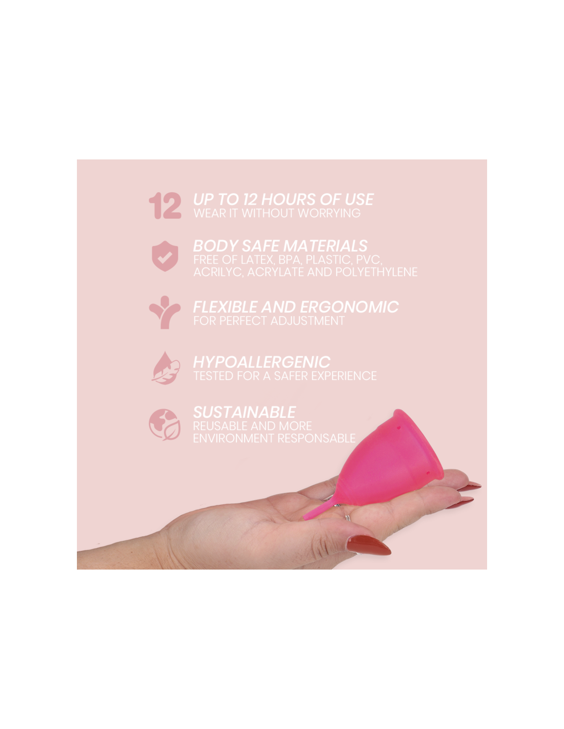 - Pagamintas iš 100 % medicininės kokybės silikono – saugiausios medžiagos, kuri liečiasi su biologiškai suderinama oda ir nesukelia jokios alerginės reakcijos ar uždegimo.